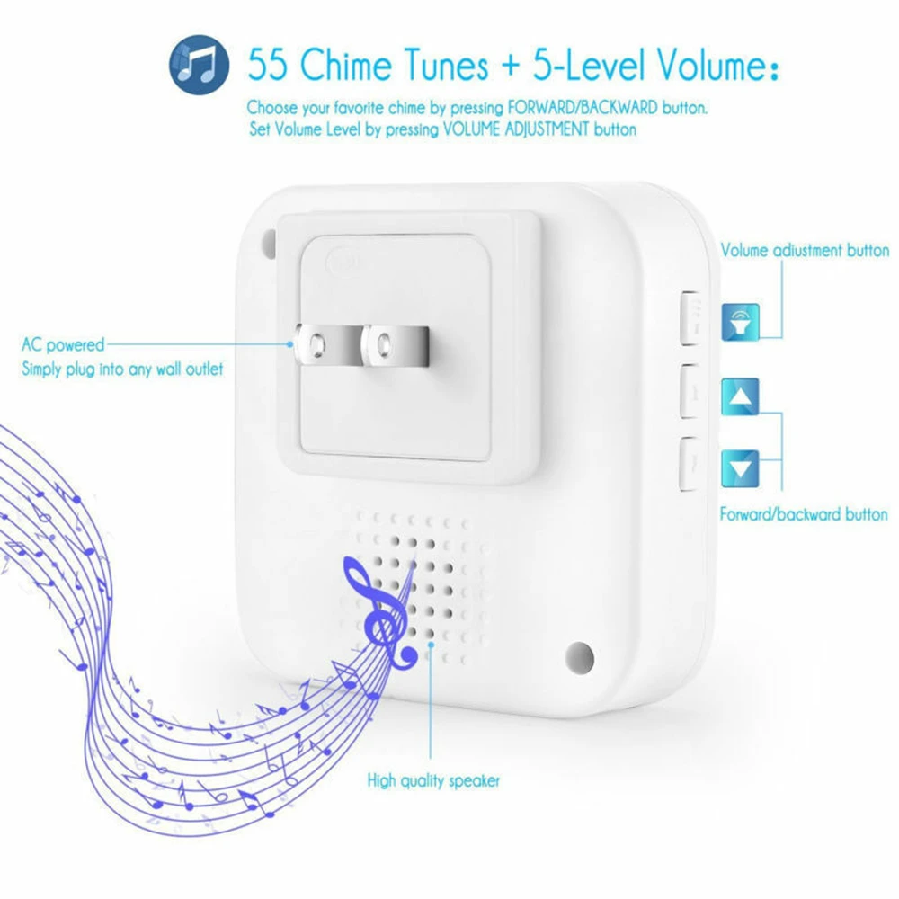 -Дистанционный диапазон в 300 метров на открытом воздухе, что позволяет легче слушать дверной звонок, где бы вы ни находились в вашем доме, вы можете взять передатчик по всему дому и не пропустите прибытие гостя.