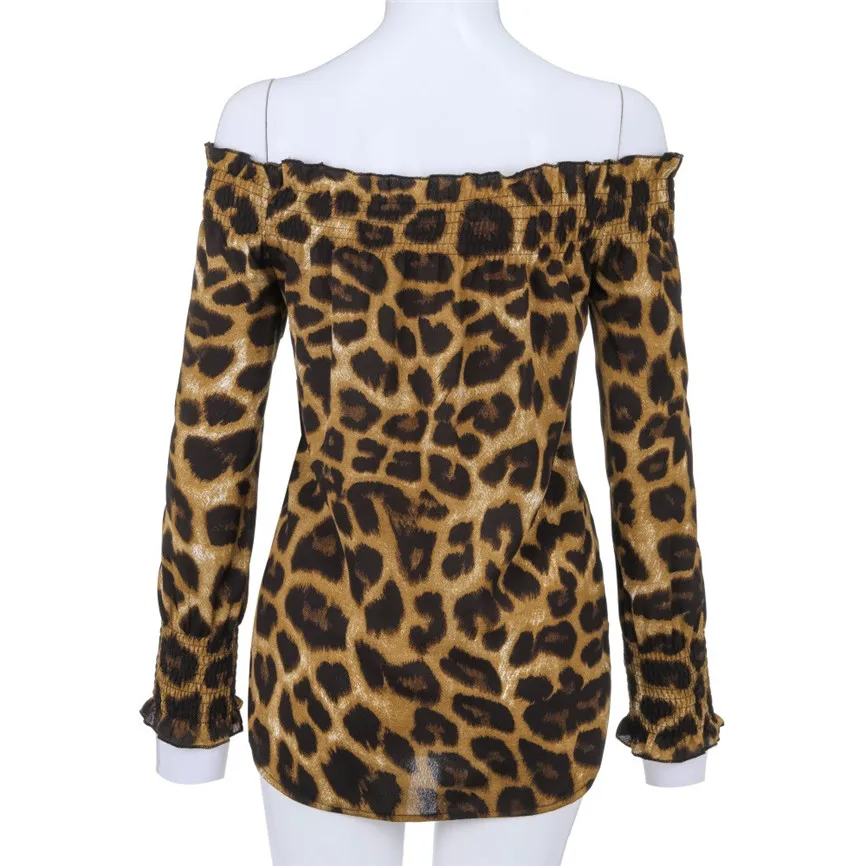 Женская Повседневная футболка с леопардовым принтом и открытыми плечами, женская блузка с длинным рукавом