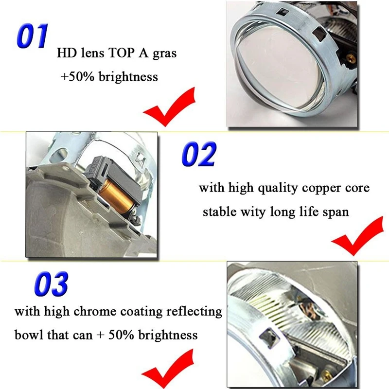 1. Это универсальный 3,0-дюймовый двойной объектив проектора для автомобилей и мотоциклов. Подходит для всех моделей и рекомендуется для профессиональной установки.
