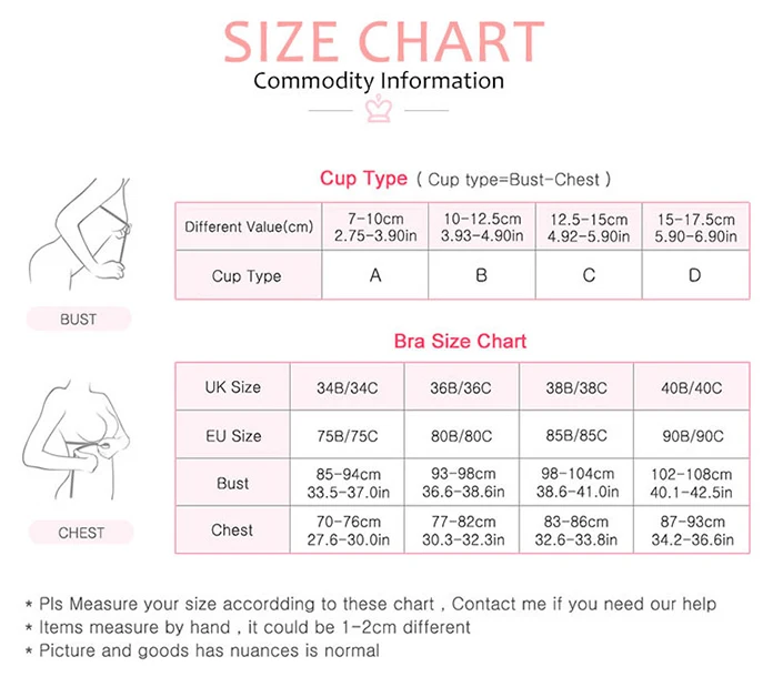 Возврат по любой причине в течение 15 дней. Все товары могут быть отправлены в течение 24-72 часов. Бренд: PROBRA Тип товара: бюстгальтеры Пол: женщины Тип Поддержки: без проводов Тип ремешка: регулируемые ремешки Тип застежки: застежка сзади, застежка спереди, четыре ряда, три крючка и петли Назначение: кормление и сон Особенности: кормление, материнство Размер: 32/70 - 34/75 - 36/80 - 38/85 - 40/90 - 42/95 О размере: Мы предлагаем вам выбрать на размер больше, чем вы обычно носите. Например: если вы обычно носите 70B, вы можете выбрать размер 75C в этой модели. Таблица размеров бюстгальтера Размер Великобритании: 34B/34C Размер ЕС: 75B/75C Обхват груди: 85-94 см/33,5-37,0 дюйма Обхват груди: 70-76 см/27,6-30 дюймов Размер Великобритании: 36B/36C Размер ЕС: 80B/80C Обхват груди: 93-98 см/36,6-38, 6 дюймов Обхват груди: 77-82 см/30,3-32,3 дюйма Размер Великобритании: 38B/38C Размер ЕС: 85B/85C Обхват груди: 98-104 см/38,6-дюйма Обхват груди: 83-86 см/32,6-дюйма Размер Великобритании: 40B/40C Размер ЕС: 90B/90C Обхват груди: 102-108 см/40,1-42,5 дюйма Грудь: 87-93/34. 2-36,6 дюйма