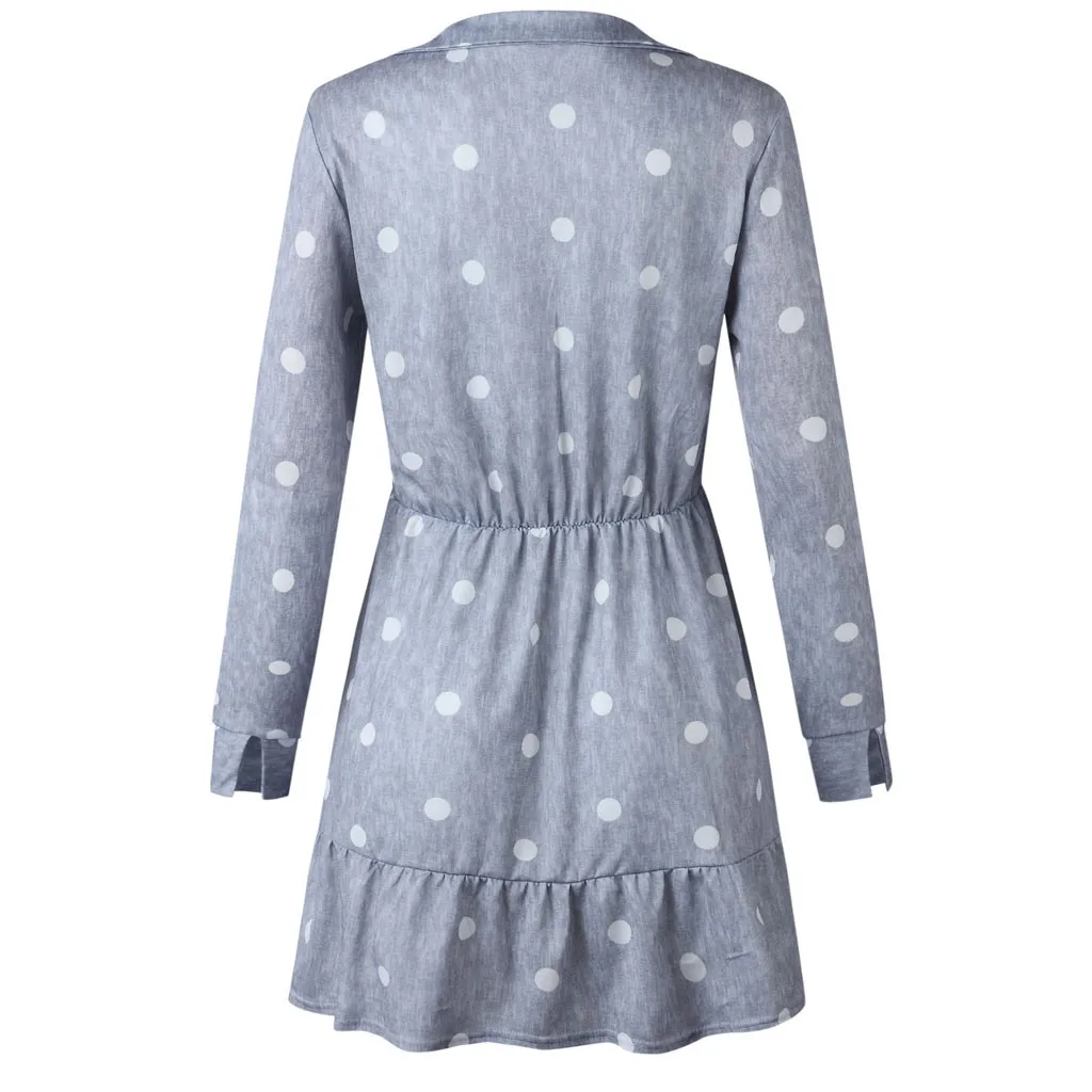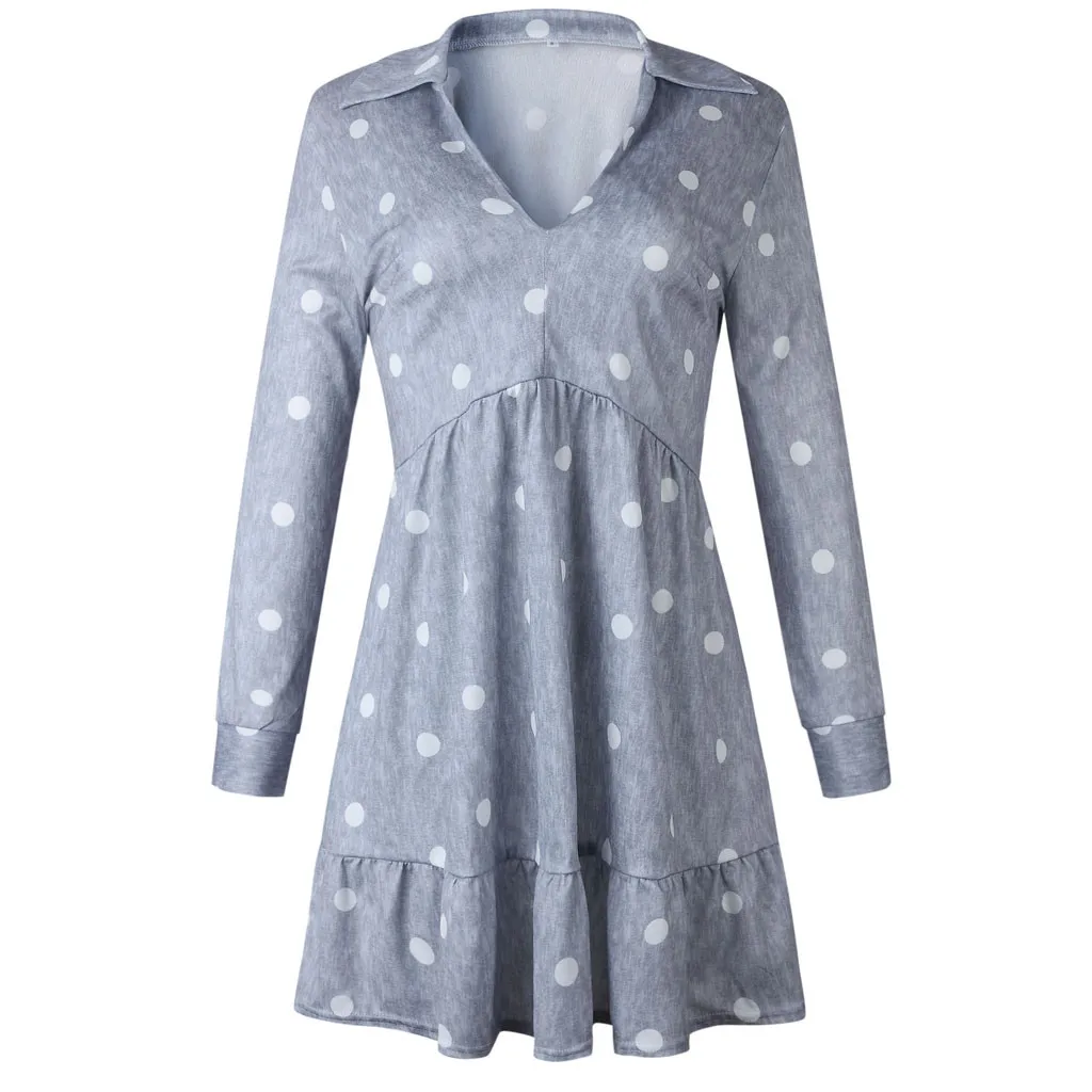 Women Dot Printing V Neck Long Sleeve Dress Evening Party Dress