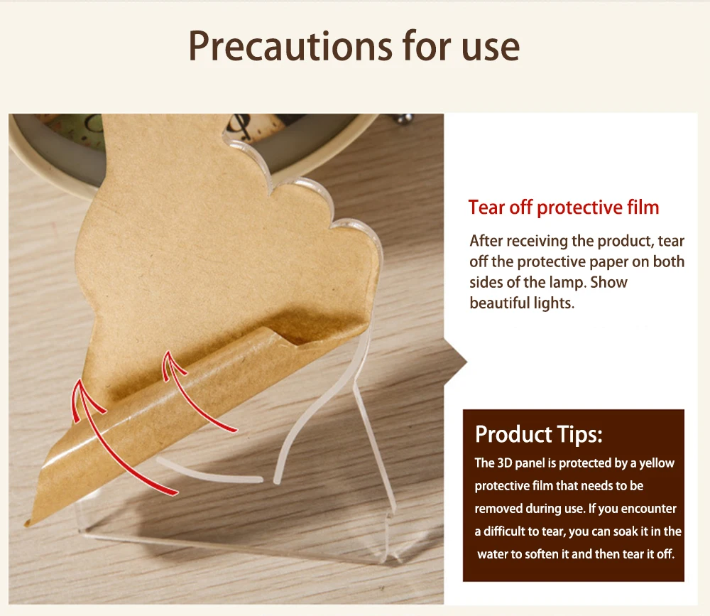 Оторвать защитная пленка После получения продукта Оторвите защитную бумагу с обеих сторон лампы. Показать красивых огней.