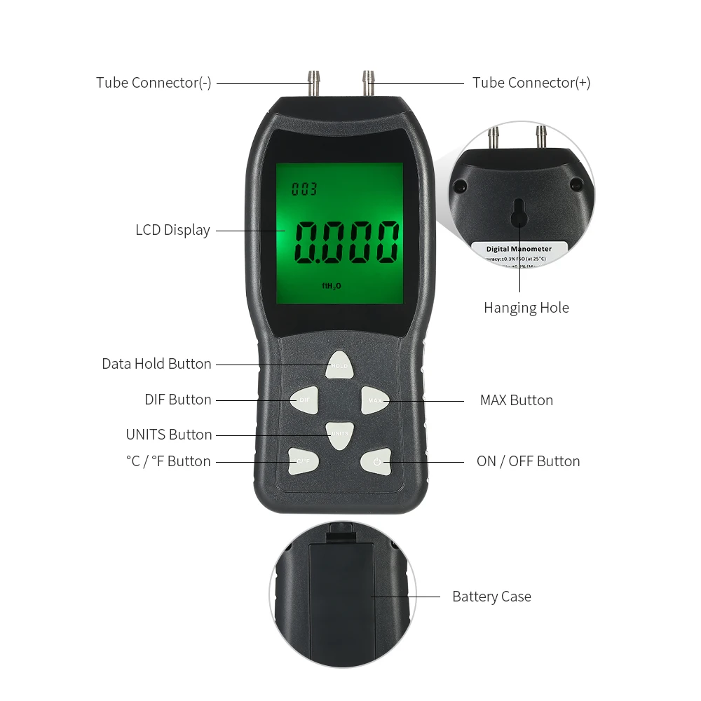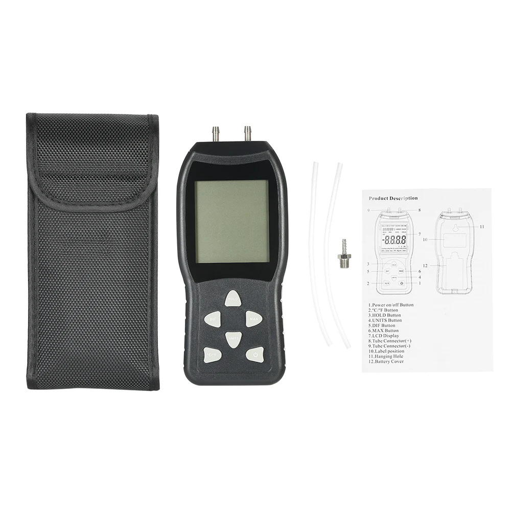 ЖК-цифровой двухпортовый манометр широко применяется для измерения перепада давления зон и труб, скорости ветра трубопровода.