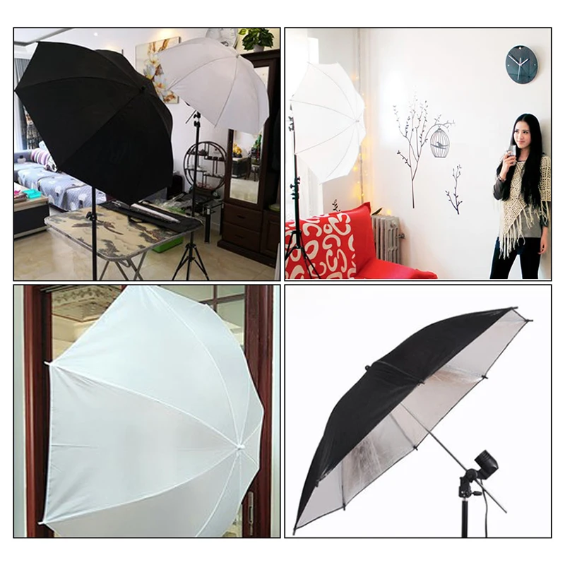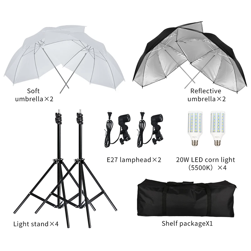 Посылка включает в себя: 2*33 "белый мягкий легкий зонтик 2 * черный и серебристый отражающий зонтик 2*20 Вт светодиодный лампочка 2 * поворотное крепление (EU Plug/US Plug/UK Plug/AU Plug) 2*2 м легкий стенд 1 * Оксфорд сумка для переноски