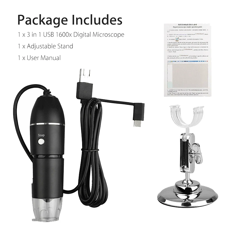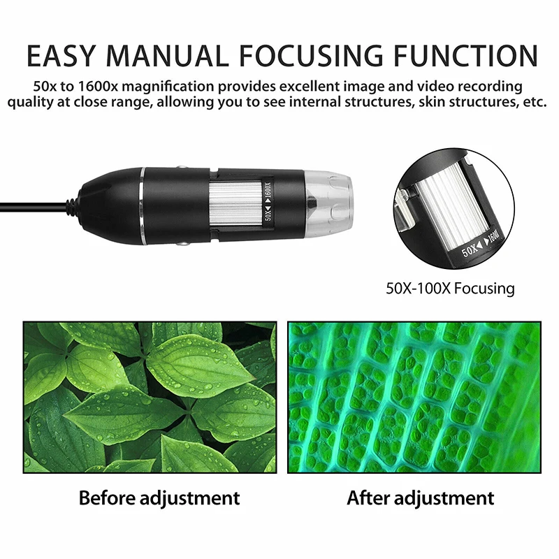 * Более широкое увеличение и изображение с высоким зрением: от 50x до 1600x увеличение обеспечивает потрясающее качество изображения и записи видео на близком расстоянии, позволяя вам видеть внутреннюю структуру, структуру кожи и т. Д.