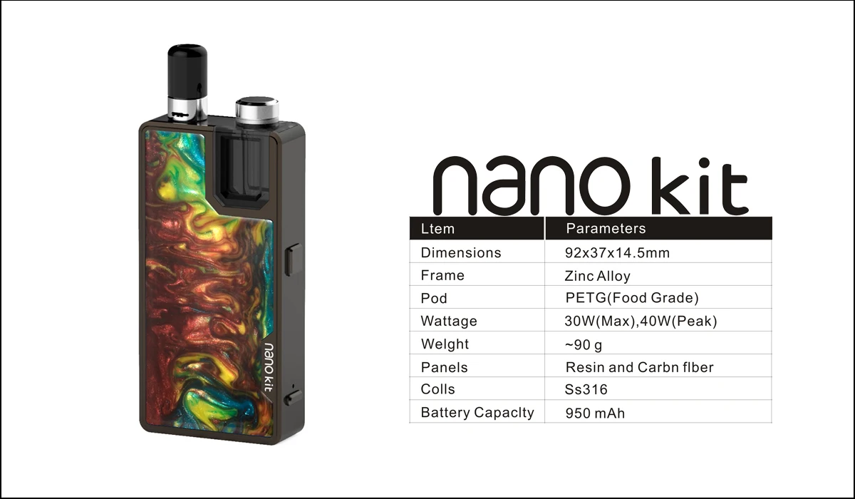 Материал: цинковый сплав Размер: 92*37*14,5 (мм) Pod Материал: PETG (пищевой) Емкость аккумулятора: 950 мАч/15C емкость Pod: 2,0 мл катушка: 0,5 Ω SS316 Макс ватт: 30 Вт/40 Вт панели: карбин волокна и смолы Цвет рамки: SS & пистолет металла