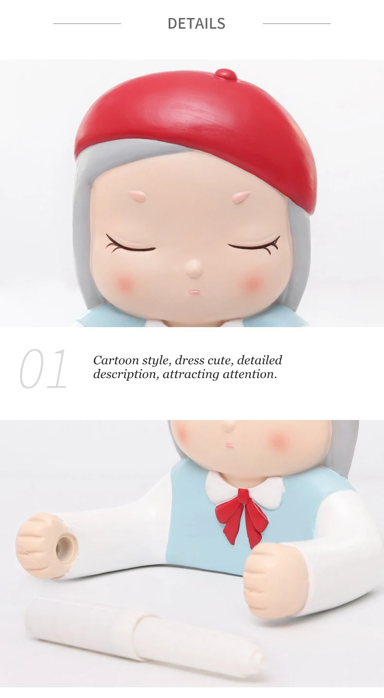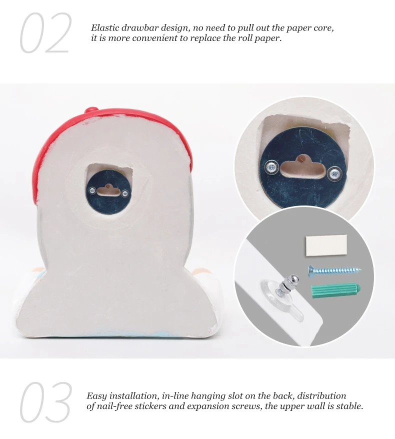 Размеры: как на картинке Обработка поверхности: окисление Материал: смола Способ установки: без перфорации Подходит для: рулонная бумага/полотенце/шарф и т. д. Посылка включает в себя: 1 держатель рулона Подарочные аксессуары Почему стоит выбрать нас? 1. Эластичный потяжный стержень для замены бумаги, общий для обычных спецификаций рулонная бумага, Настенный дизайн экономит пространство, срок службы сливы. 2. Мультяшный стиль, милое платье, подробное описание, привлекающее внимание. 3. Эластичный дизайн drawbar, не нужно вытягивать бумажный сердечник, удобнее заменить Рулонную бумагу. 4. Простая установка, встроенный подвесной слот на спине, распределение наклеек без гвоздей и Расширительных винтов, верхняя стена стабильна.