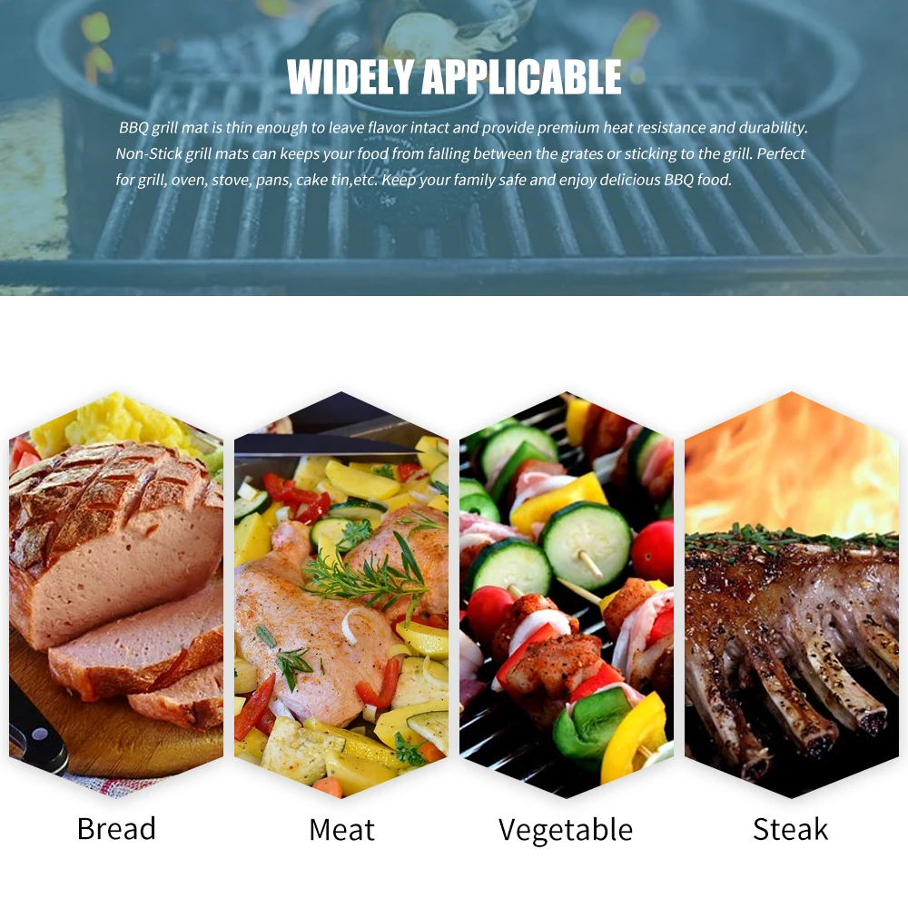 [Высокая термостойкость]Коврики для гриля могут использоваться непрерывно при высокой температуре, что подходит для приготовления различных продуктов, таких как курица, говядина, свинина и т. д.