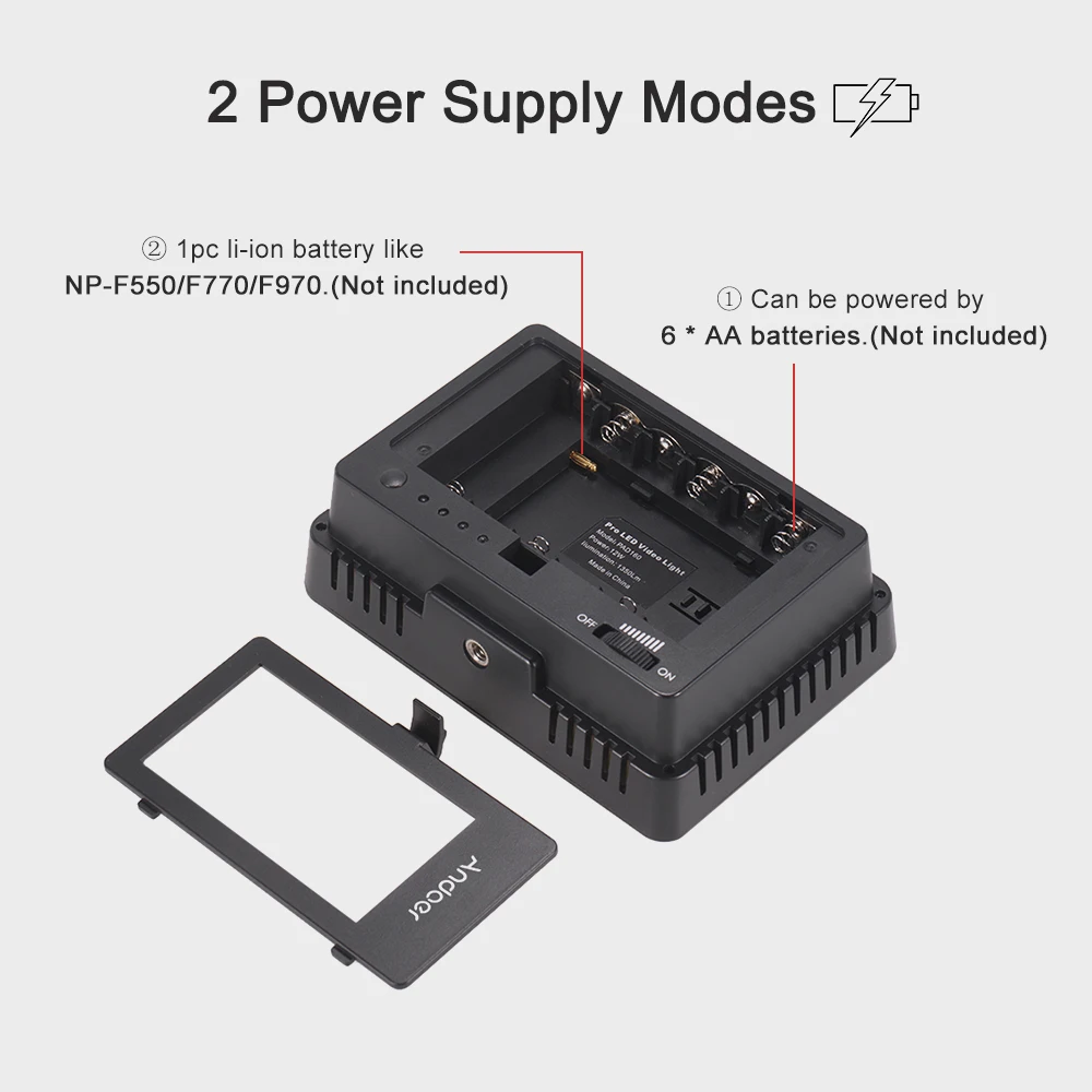 Он может питаться от батарей 6 * AA или 1 литий-ионного аккумулятора, таких как NP-F550/F770/F970. (батареи не включены.)