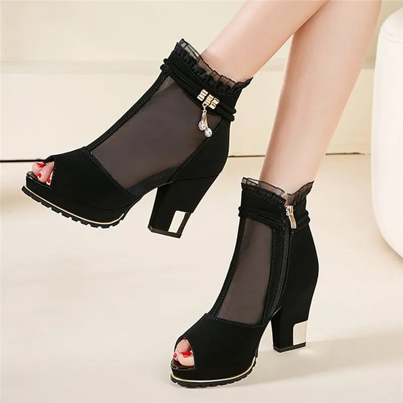Botas Mujer размера плюс с широко открытым носком на очень высоком каблуке в римском стиле с отделкой бисером и застежкой; Para Для женщин пикантные квадратный каблук; Ботильоны; Bota Feminina