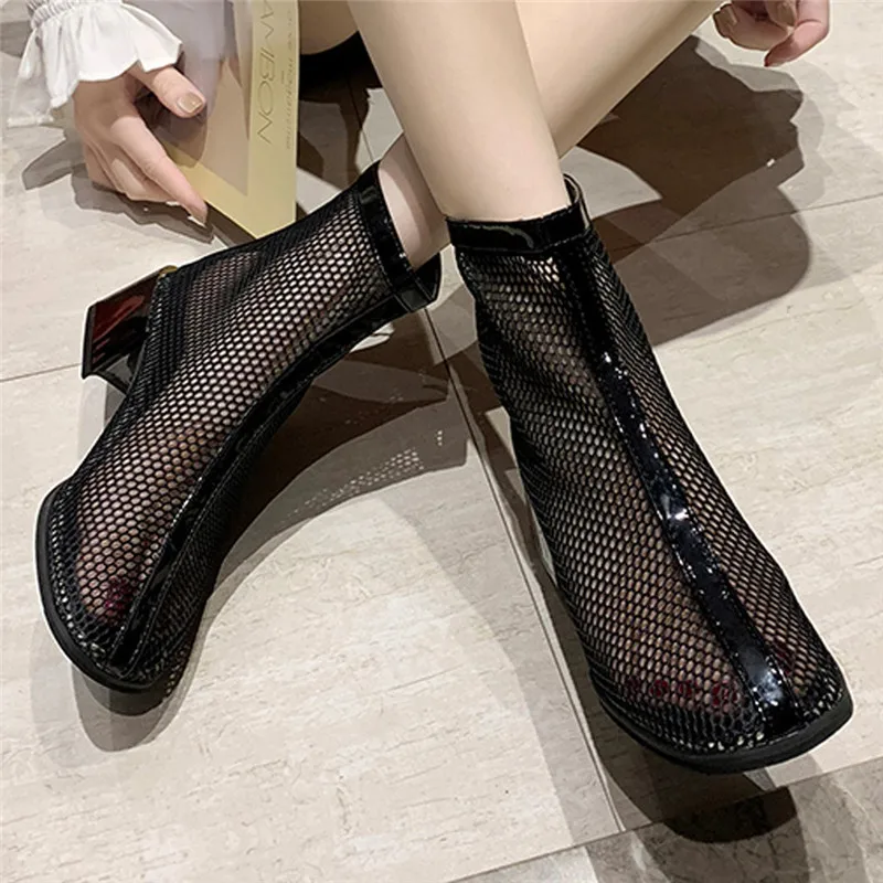 Botas Mujer; Пикантные ботильоны с круглым носком; Сетчатые Ботильоны на молнии спереди; Женские черные короткие ботиночки на квадратном каблуке