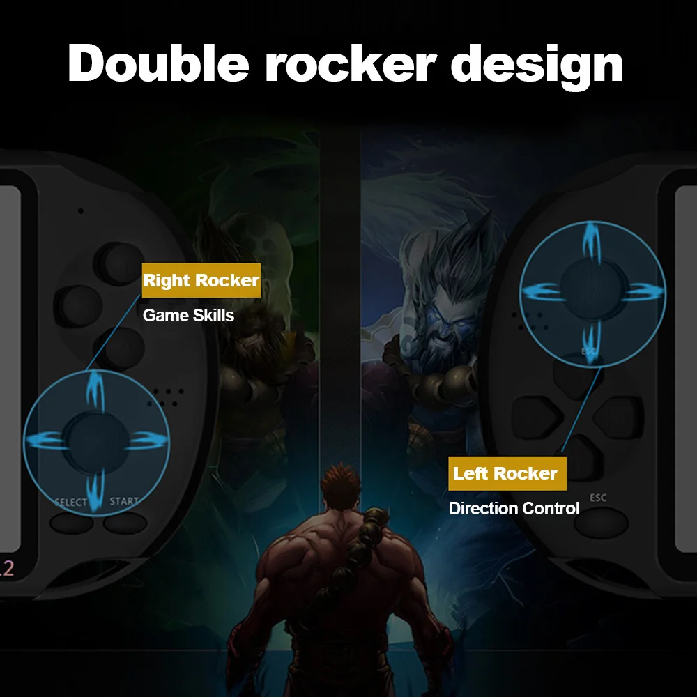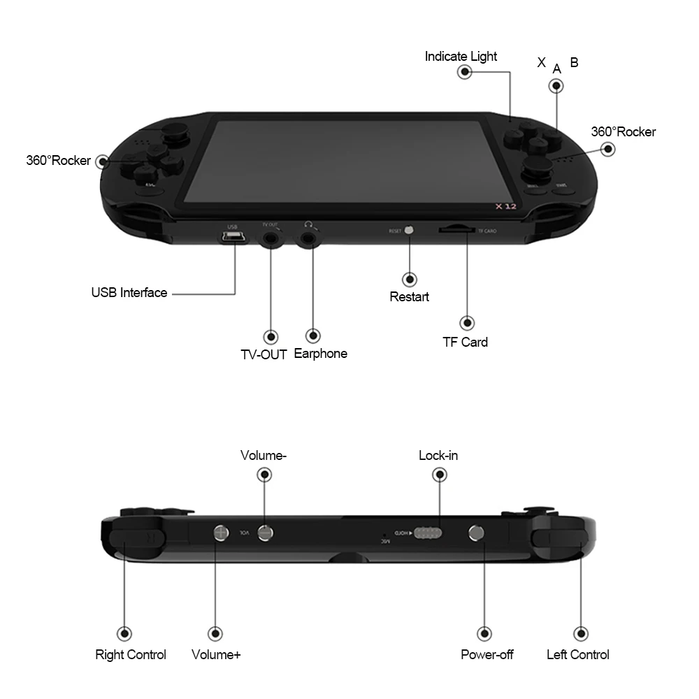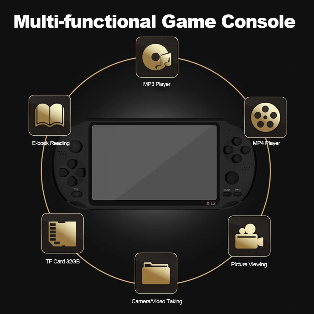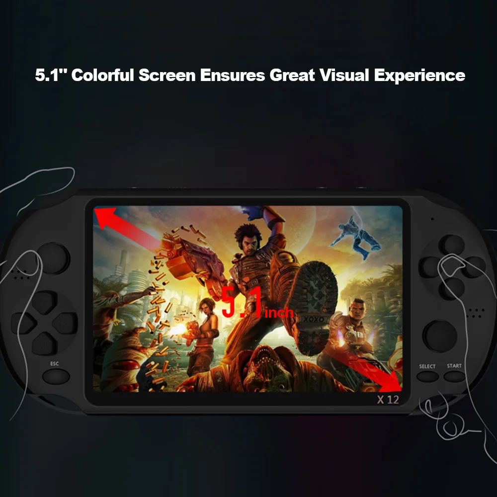 X12 портативная игровая консоль-это многофункциональная игровая консоль, она также может использоваться в качестве MP3/MP4 плеера, например, для воспроизведения видео, воспроизведения музыки, просмотра изображений, чтения электронных книг. 5,1 "цветной экран обеспечивает большой визуальный опыт. Также позволяет памяти точки останова, позволяя игре автоматически хранить в памяти, чтобы продолжать играть рядом с прямым считыванием прогресса.
