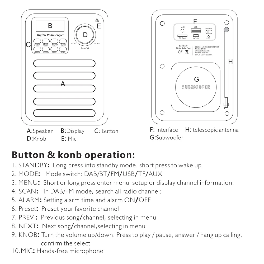 * Переключение режимов между DAB, BT, tf-картой/u-диском, линейный вход и fm-радио.