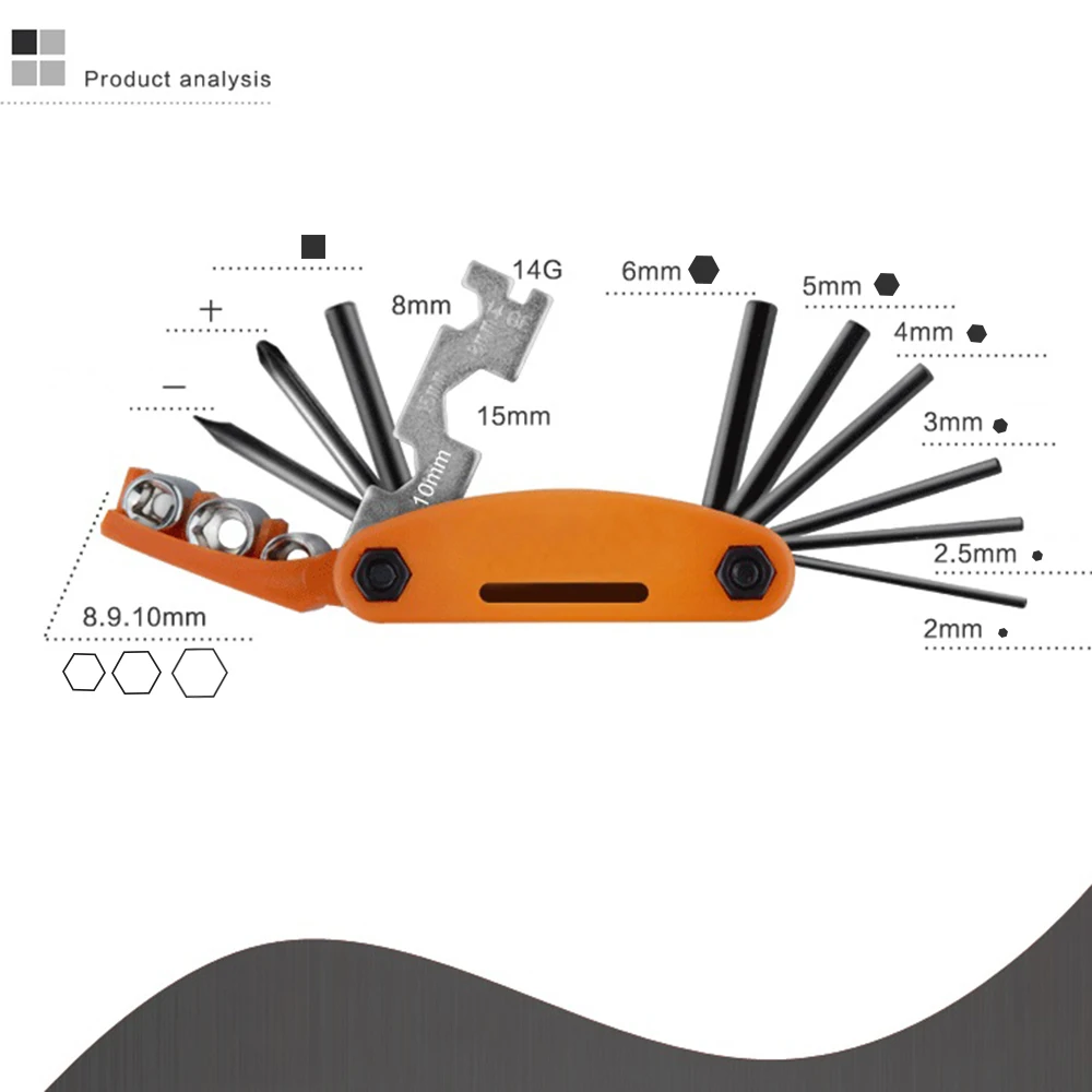 16 в 1 многофункциональные инструменты для ремонта велосипедов Складывающийся Набор шестигранных ключей сочетает в себе все популярные размеры шестигранных гаечных ключей в один Удобный Складной инструмент, устраняя необходимость в беспорядке инструментов. Его многофункциональная композитная ручка удобна, легка, не скользит, гладкая эргономичная работа и на 30% прочнее, чем стальные ручки. Вес: около 215 г