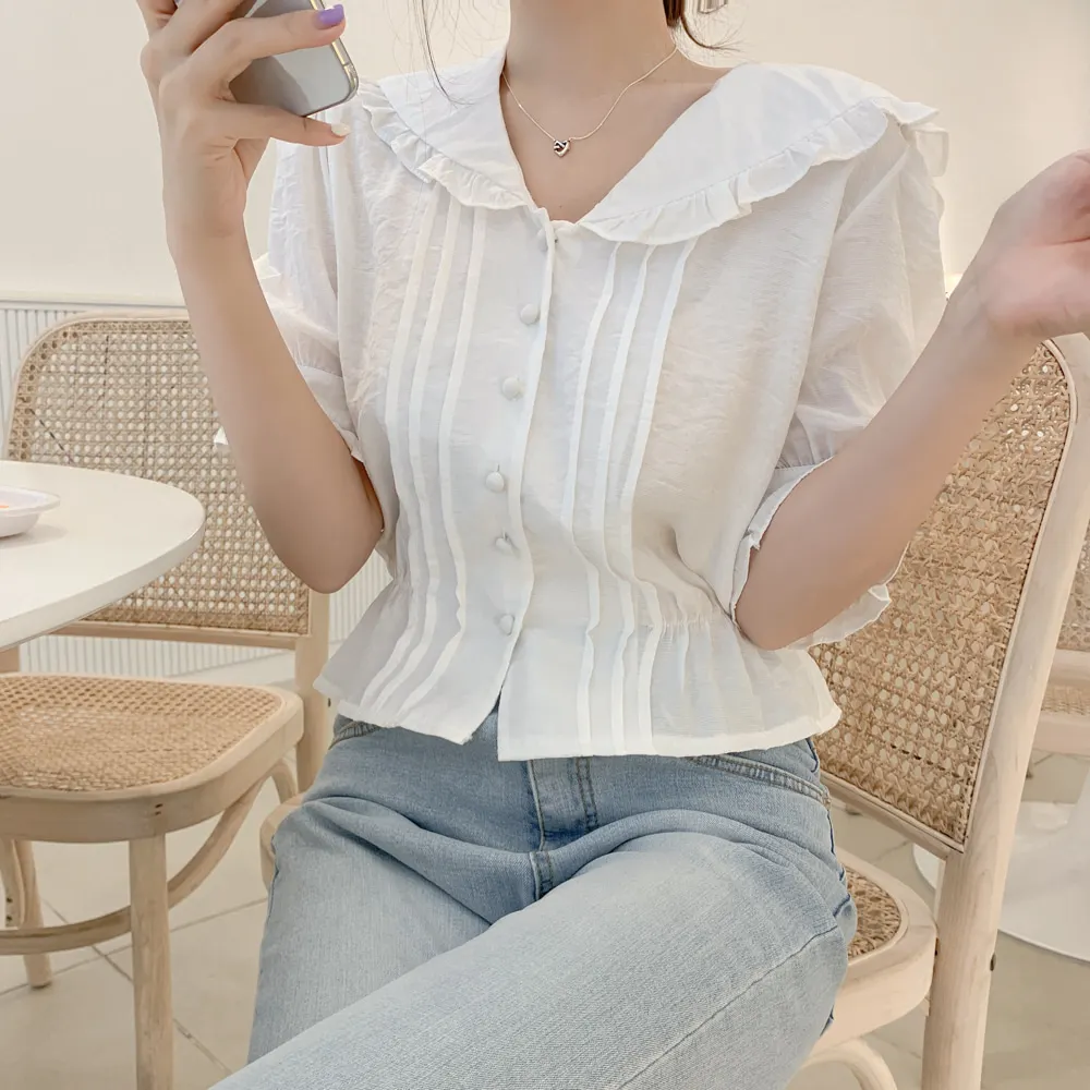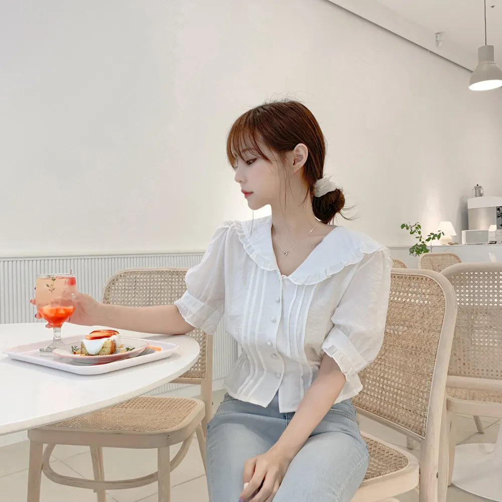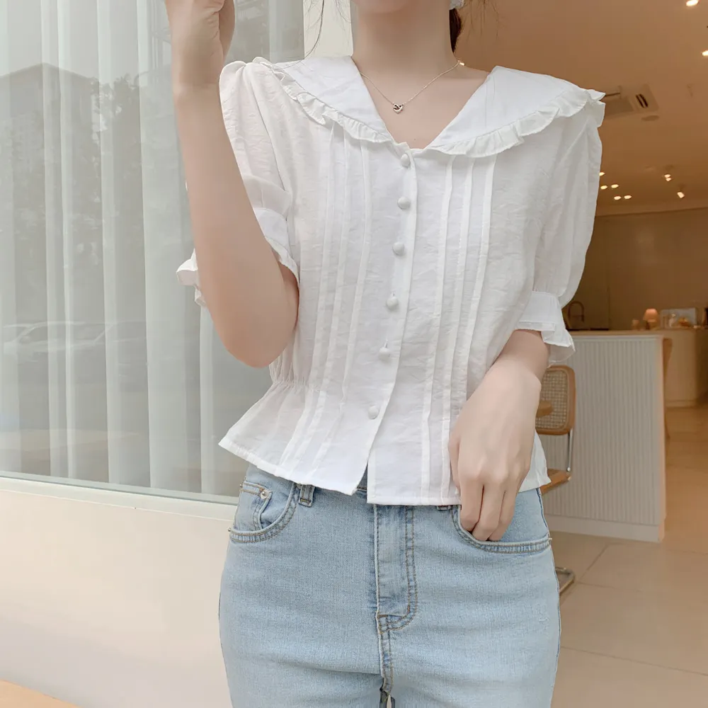 Милые сладкие топы, винтажный женский топ с коротким рукавом, корейский стиль, консервативный стиль, Базовая Блузка с баской, белая блузка