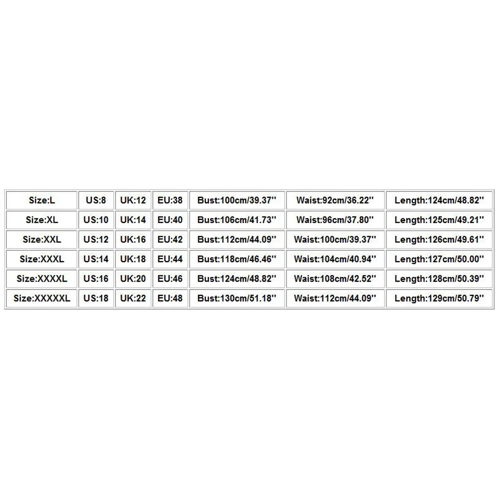 Размер: L США: 8 Великобритания: 12 ЕС: 38 бюст: 100 см/39,37 ''талия: 92 см/36,22'' Длина: 124 см/48,82'' Размер: XL США: 10 Великобритания: 14 ЕС: 40 Бюст: 106 см/41,73 ''Талия: 96 см/37,80'' Длина: 125 см/49,21'' Размер: XXL США: 12 Великобритания: 16 ЕС: 42 Бюст: 112 см/44,09 ''Талия: 100 см/39,37'' Длина: 126 см/49,61'' Размер: 3XL США: 14 великобритания: 18 ЕС: 44 Бюст: 118 см/46,46 ''Талия: 104 см/40,94'' Длина: 127 см/50,00'' Размер: 4XL США: 16 Великобритания: 20 ЕС: 46 Бюст: 124 см/48,82 ''Талия: 108 см/42,52'' Длина: 128 см/50,39'' Размер: 5XL США: 18 Великобритания: 22 ЕС: 48 Бюст: 130 см/51,18 ''Талия: 112 см/44,09'' Длина: 129 см/50,79''