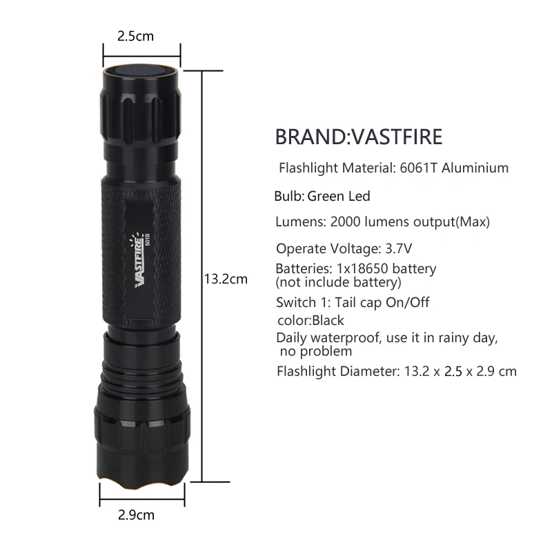 Материал фонарика: 6061T алюминий Прочный ударопрочный ободок для усиленной самозащиты Лампа: зеленый/красный/белый Работают Напряжение: 3,7 V Батареи: 1x аккумулятор 18650 (без аккумулятора) Переключатель 1: задняя крышка ВКЛ./ВЫКЛ. Ежедневный Водонепроницаемый, используйте его в дождливый день, никаких проблем Фонарик Диаметр: 13,2x2,9x2,9 см Посылка включает: 1 * Тактический зеленый светодиодный фонарик (без батареи)