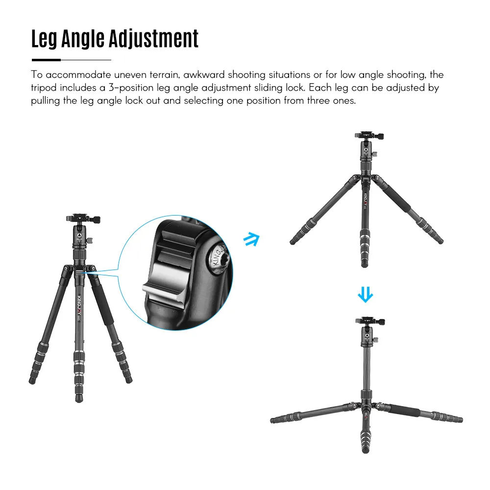 Регулировка угла ноги: для размещения на неровной поверхности, неловких ситуаций съемки или для съемки с низким углом, штатив включает в себя 3-позиционный угол наклона ног скользящей застежкой. Каждая ножка может быть отрегулирована, вытягивая ногу угол блокировки и выбирая одну позицию из трех.