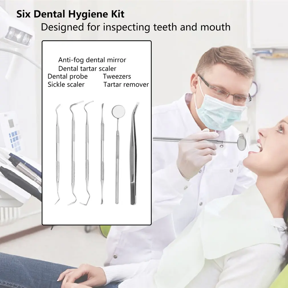 Этот набор для гигиены зубов включает в себя антипротивотуманное стоматологическое зеркало из нержавеющей стали (зеркало для рта), стоматологическое устройство/стоматологический исследователь/стоматологический зонд (металлическая зубочистка). Пинцет (Пинцет колледжа), серповидный скалер и зубной камень скалер/скребок или средства для удаления зубного камня.