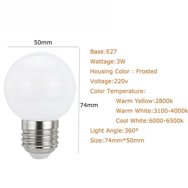 Основание Тип: E27 Мощность: 3 Вт Количество светодиодов: 15 светодиодов Напряжение: 220 v Корпус: прозрачный/матовый Цветовая температура: холодный белый: 6000-6500 k Теплый белый: 3100-4000 k Теплый желтый: 2800 k CRI: 70-90 Угол луча: 360 градусов Размер: 74 мм * 50 мм Световой поток: 150lm