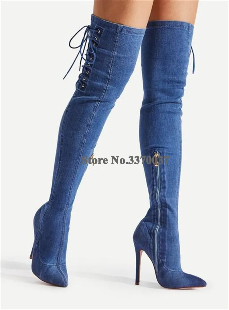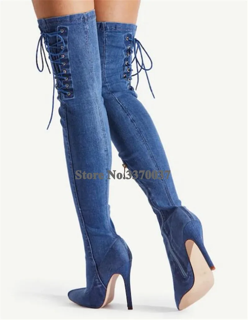 Новейшая модель; Пикантная женская обувь с острым носком Сапоги выше колена на каблуке-шпильке деним Туфли-гладиаторы на высоком каблуке, со шнуровкой сбоку тонкий Стиль длинные, с высоким каблуком; Ботинки на высоком каблуке