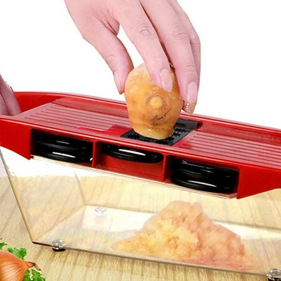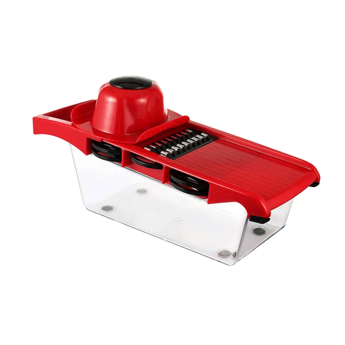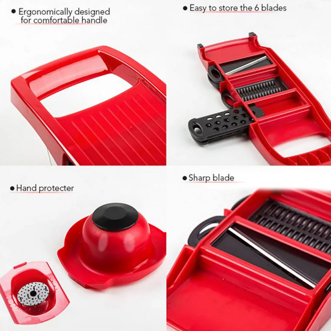 4. Защита рук и рукоятка-Профессиональный эргономичный дизайн, который делает овощерезку удобной для удержания или контроля, не беспокоясь о том, что повредит ваши руки. Просто закрепите овощи внутри защитного колпачка и ваши руки полностью безопасны от любых возможных травм.
