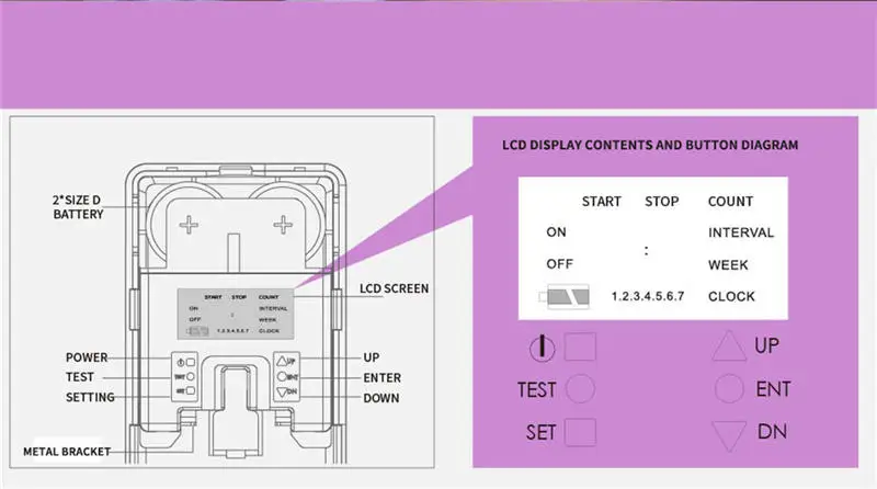 1. Три режима настройки рабочего дня: ①From с понедельника по пятницу ②From с понедельника по субботу ③From с понедельника по воскресенье 2. Можно установить время запуска и остановки по желанию (0-24 ч). 3. Интервалы распыления могут варьироваться от 1 минуты до 60 минут. 4. Количество брызг можно проверить. 5. Встроенный ЖК-часы отображает время.