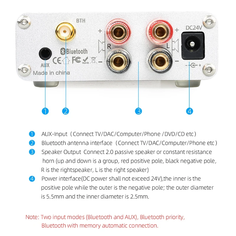 Рабочее напряжение: DC24V4A (интерфейс усилителя мощности характеристики: внешний диаметр 5,5 мм, внутренний 2,5 мм)