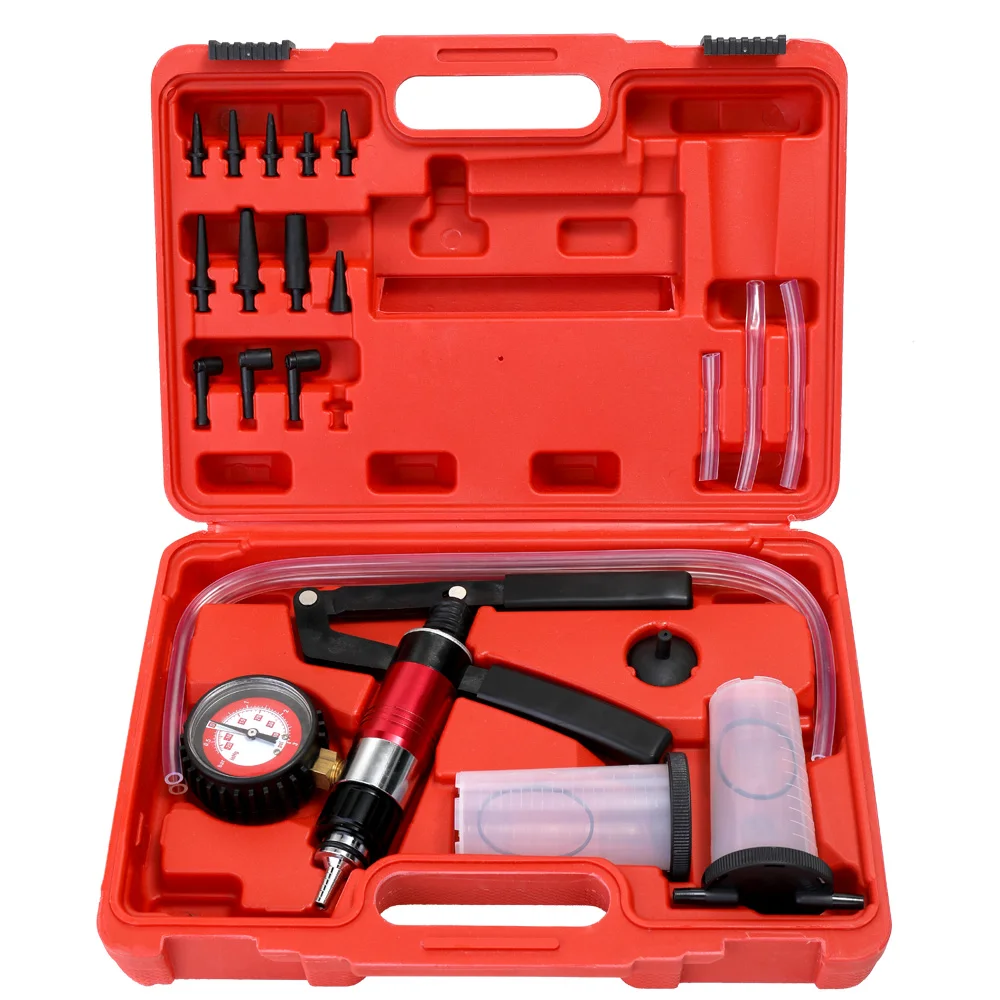 Этот ручной тестер тормозов и муфт bleeder Набор вакуумных насосов для автомобиля, мотоцикла и т. д. легко тормозит и тестирует автомобильные вакуумные системы самостоятельно. Работает на всех автомобилях и моделях. Комплексный набор вакуумных насосов для цеха включает резервуар и адаптер для ниппеля для торможения и кровотечения топливной линии. Ручной насос вытягивает жидкость через сосок, устраняя необходимость использования тормозного рычага или педали. Ручной насос с манометром позволяет тестировать многие вакуумные системы, например: топливные насосы, карбы и т. Д.