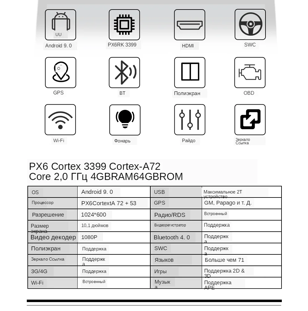 PX6 Cortex A72 + A53 Выходная мощность: 4*45 Вт Bluetooth 4,0, радио IC TDA 7786. Усилитель 7851 HDMI: видео выход Рабочая температура-20 ℃-+ 70 ℃ Видео: поддержка 1080P,AUX IN, RCA выход