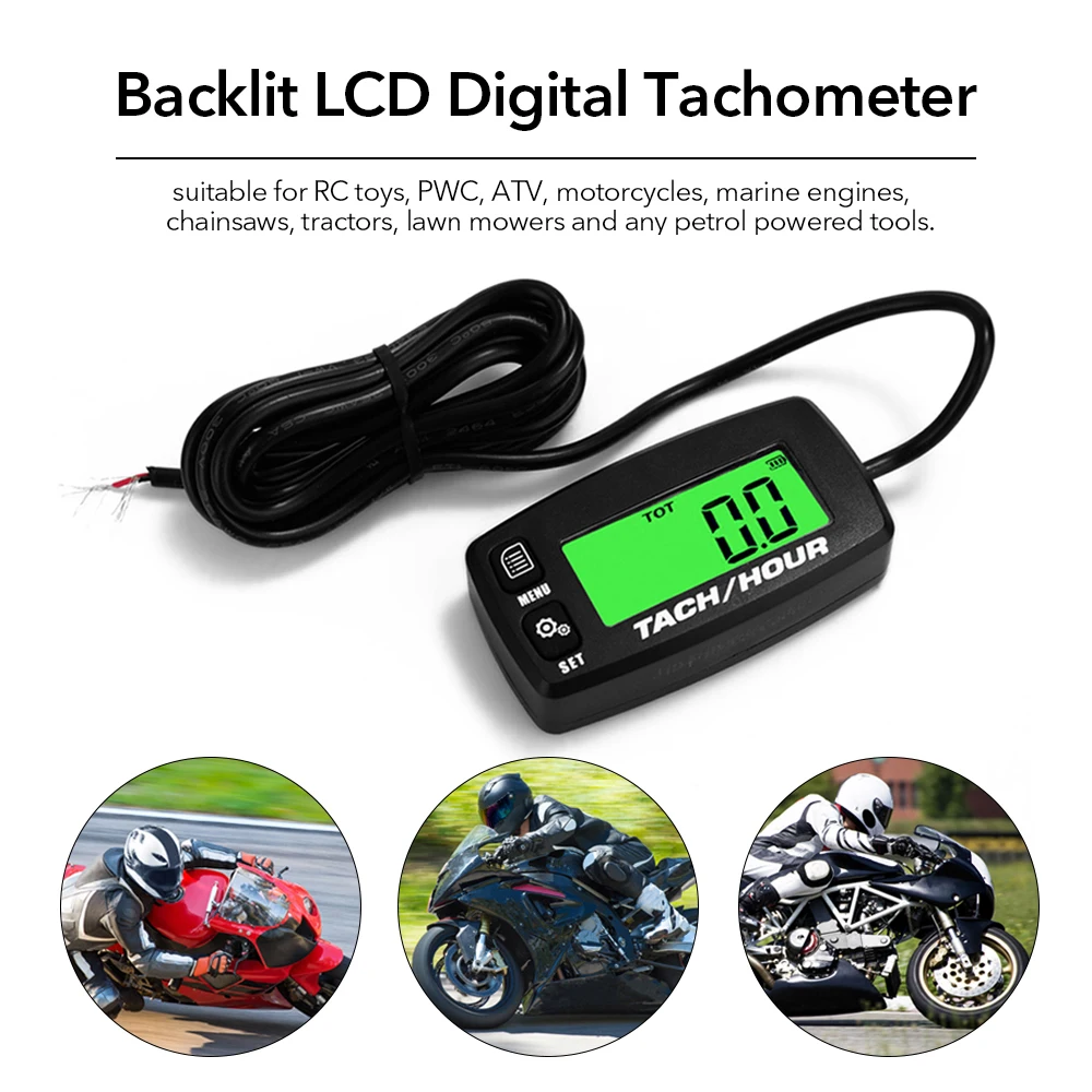 Это своего рода качественный цифровой тахометр с большим ЖК-дисплеем, задний светильник, простая установка и удобство чтения данных. Полный водонепроницаемый, подходит для RC игрушек, PWC, ATV, мотоциклов, морских двигателей, бензопилы, тракторов, газонокосилок и любых бензиновых инструментов. Вы можете попробовать.