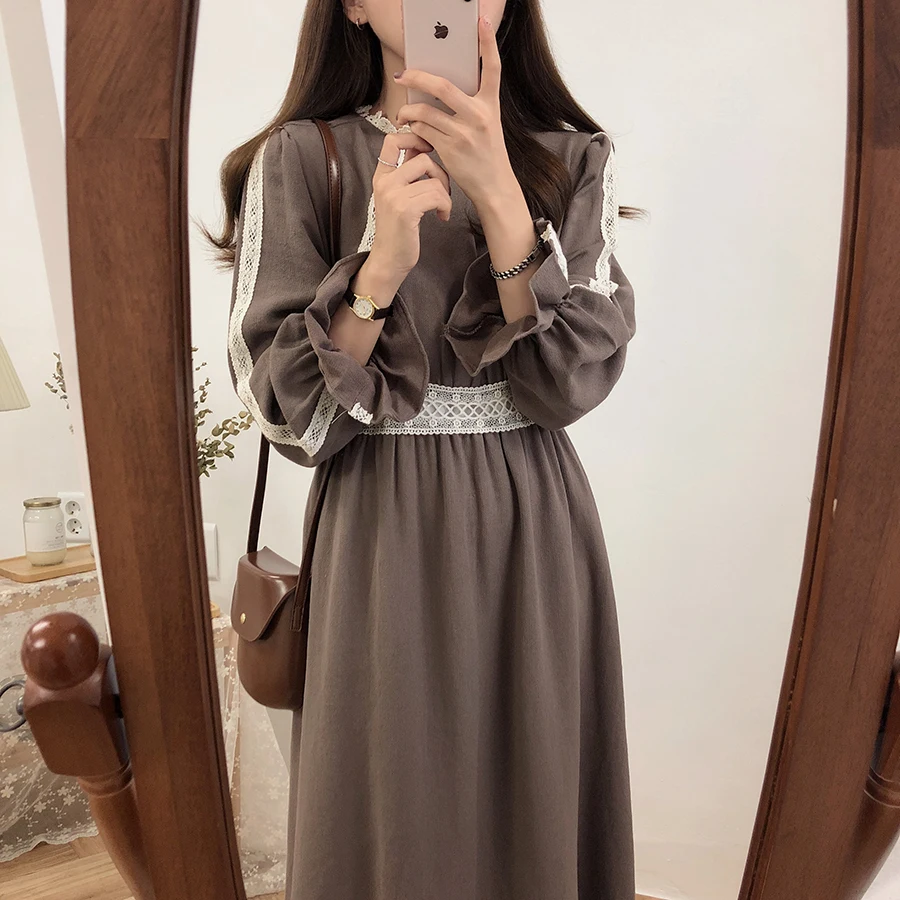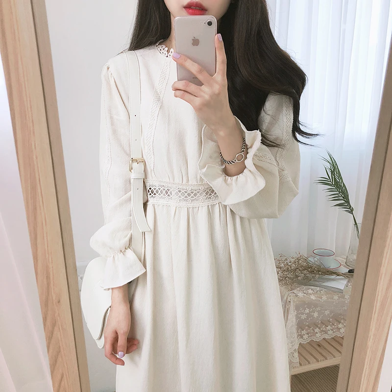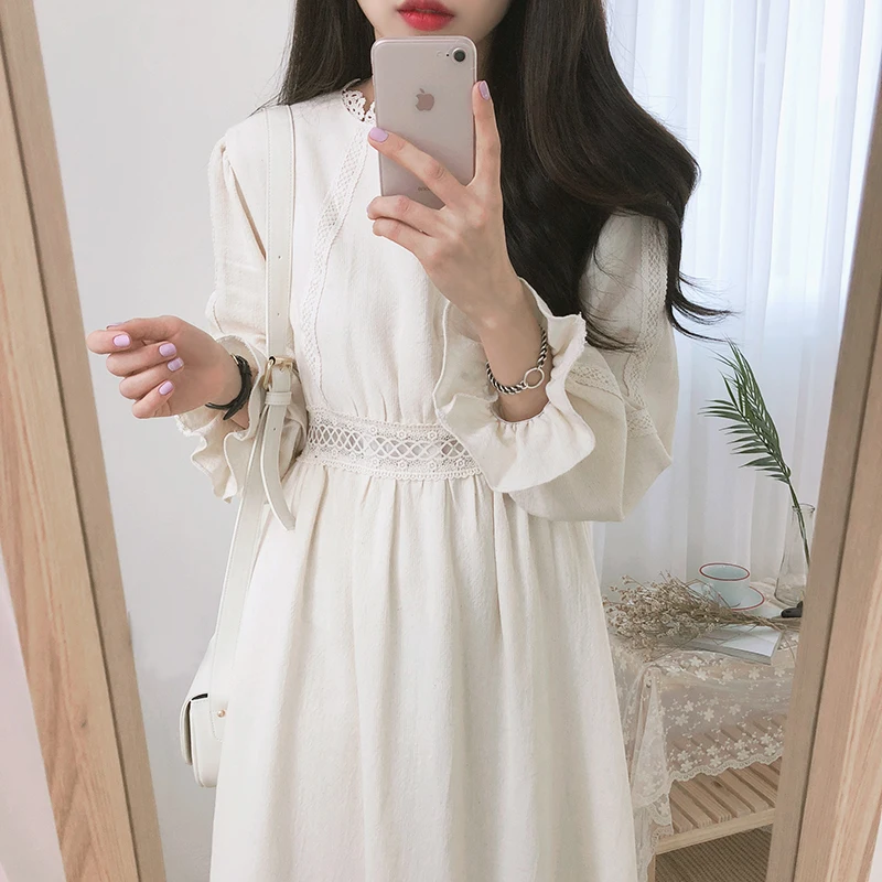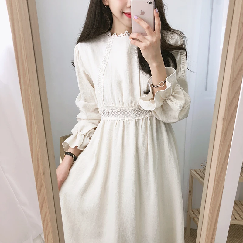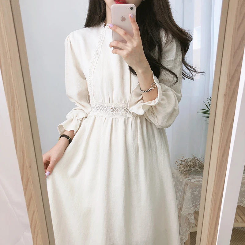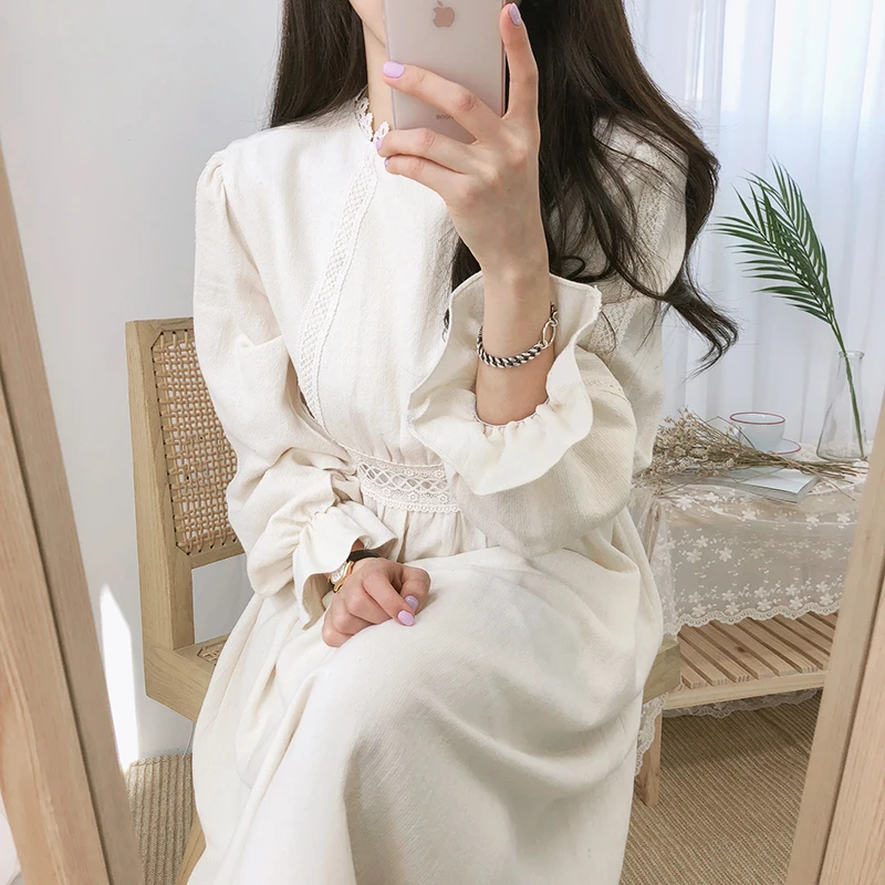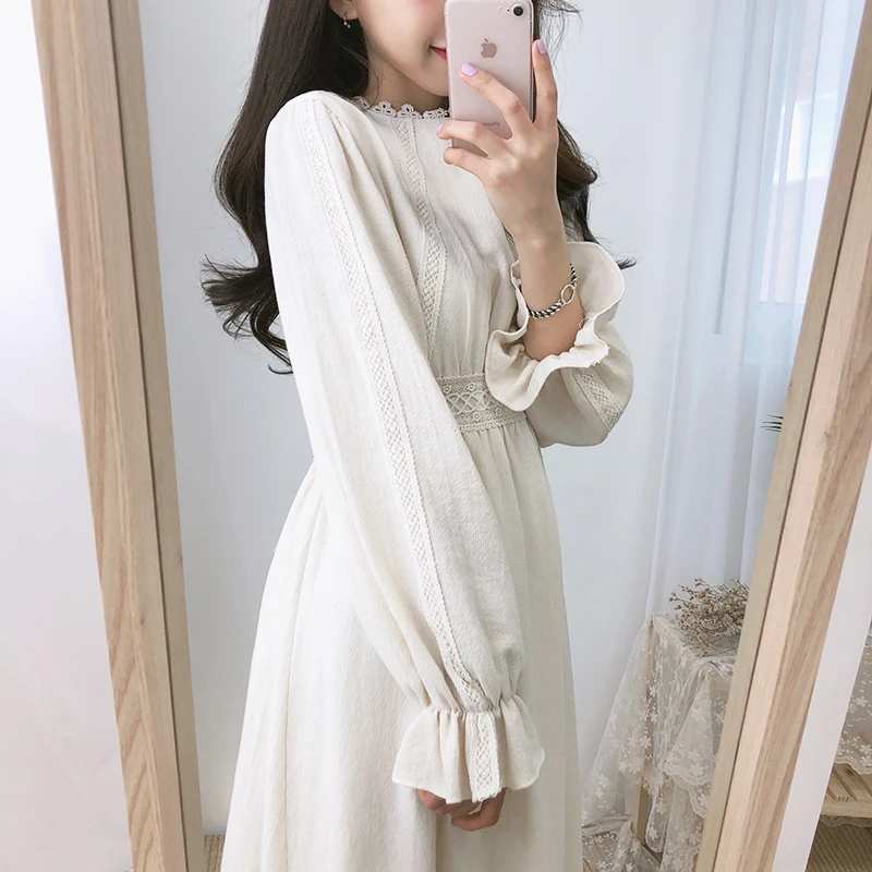 Винтажные платья из хлопка, женская мода, Осень-зима, базовая одежда, лоскутное платье, белое кружевное вязаное крючком милое платье, длинное 8109