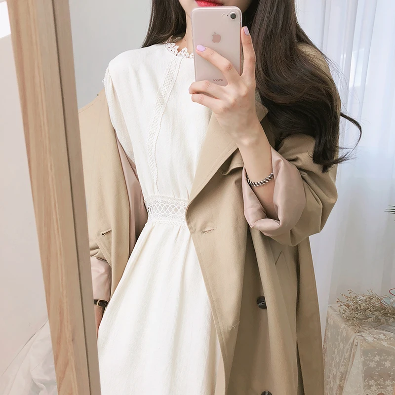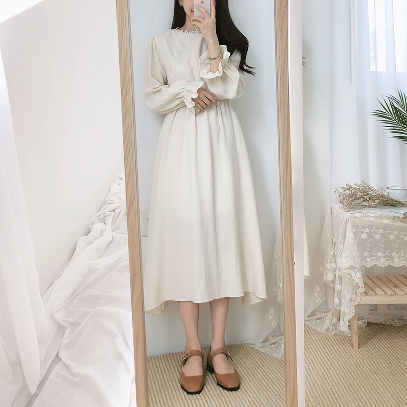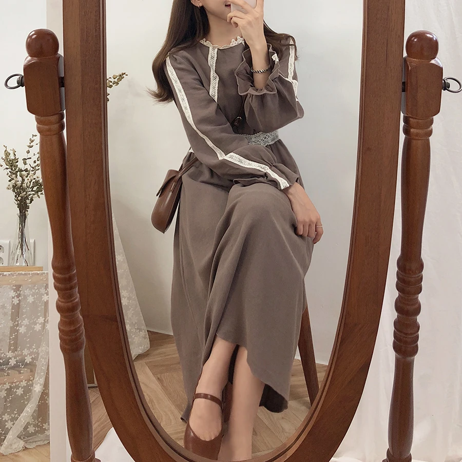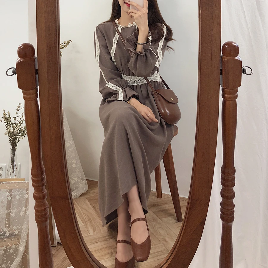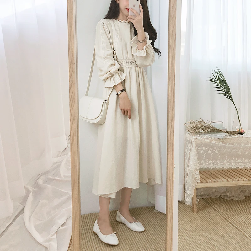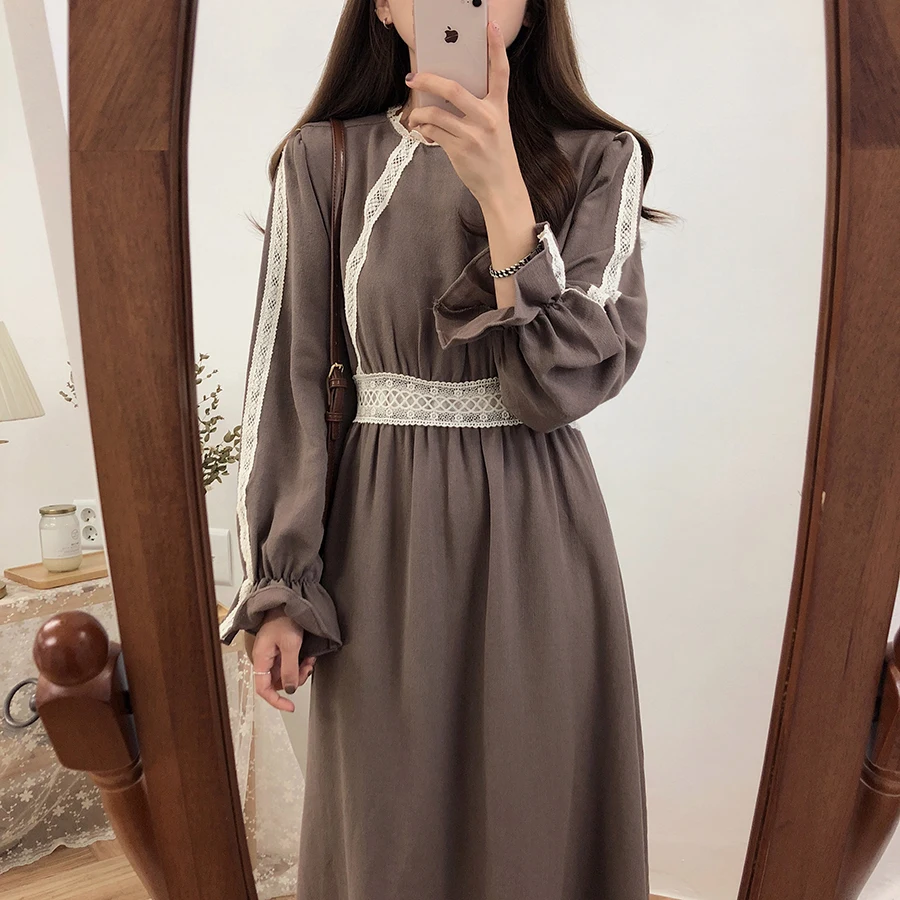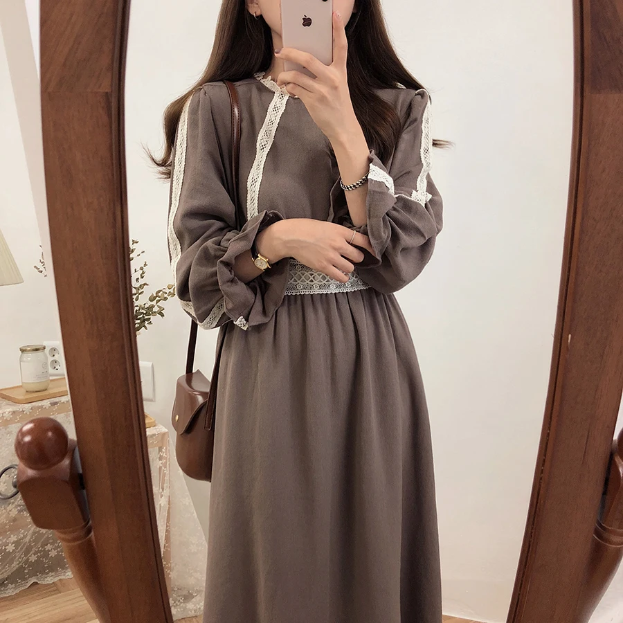 Винтажные платья из хлопка, женская мода, Осень-зима, базовая одежда, лоскутное платье, белое кружевное вязаное крючком милое платье, длинное 8109