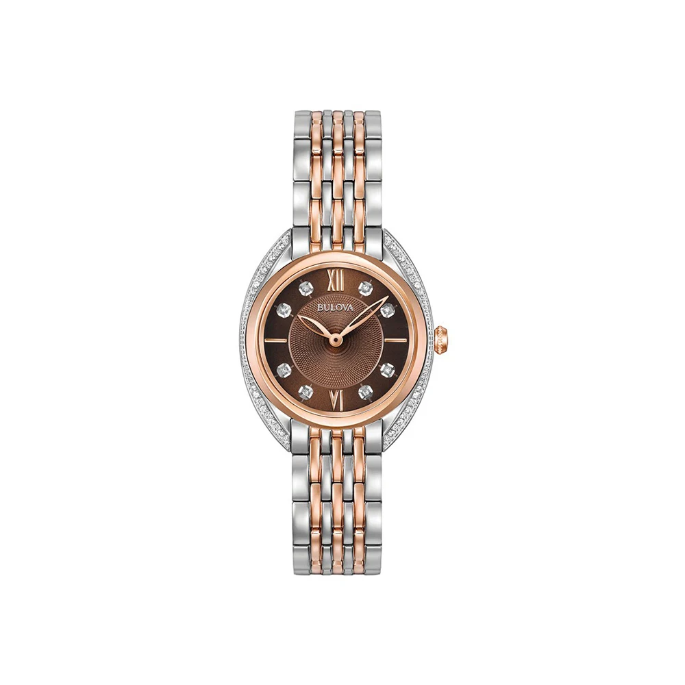 Кварцевые часы. Корпус и браслет выполнены из нержавеющей стали с частичным IP покрытием под цвет розового золота. Сапфировое стекло. Корпус и коричневый циферблат украшены бриллиантами. Диаметр 30 мм, толщина 7,4 мм. Водозащита 30м.