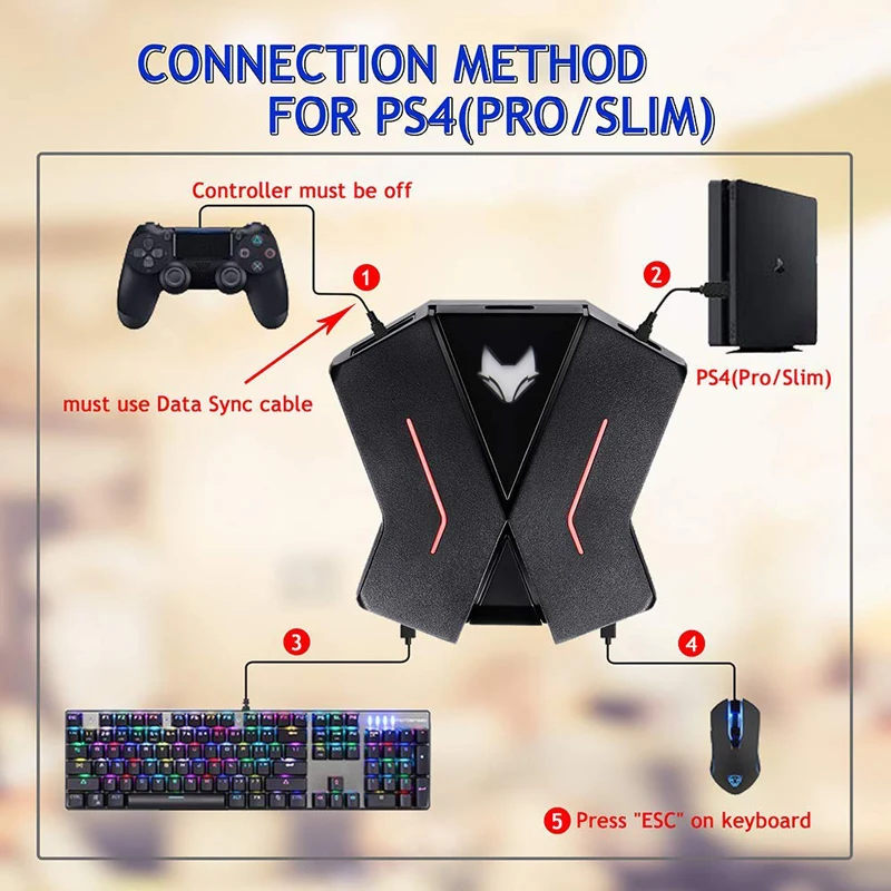 4. Режим PS4: Используйте для консоли PS4, Подключите конвертер к консоли PS4 выполните действия по подключению, нажмите на клавиатуру «esc''» для активного режима PS4