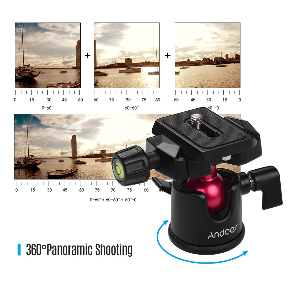 Гибкая шаровая Головка:С быстроразъемной пластиной, легко устанавливается и снимается; Вращение на 360 ° для панорамной съемки; Встроенный уровень пузырьков, вы можете легко найти лучший угол съемки.