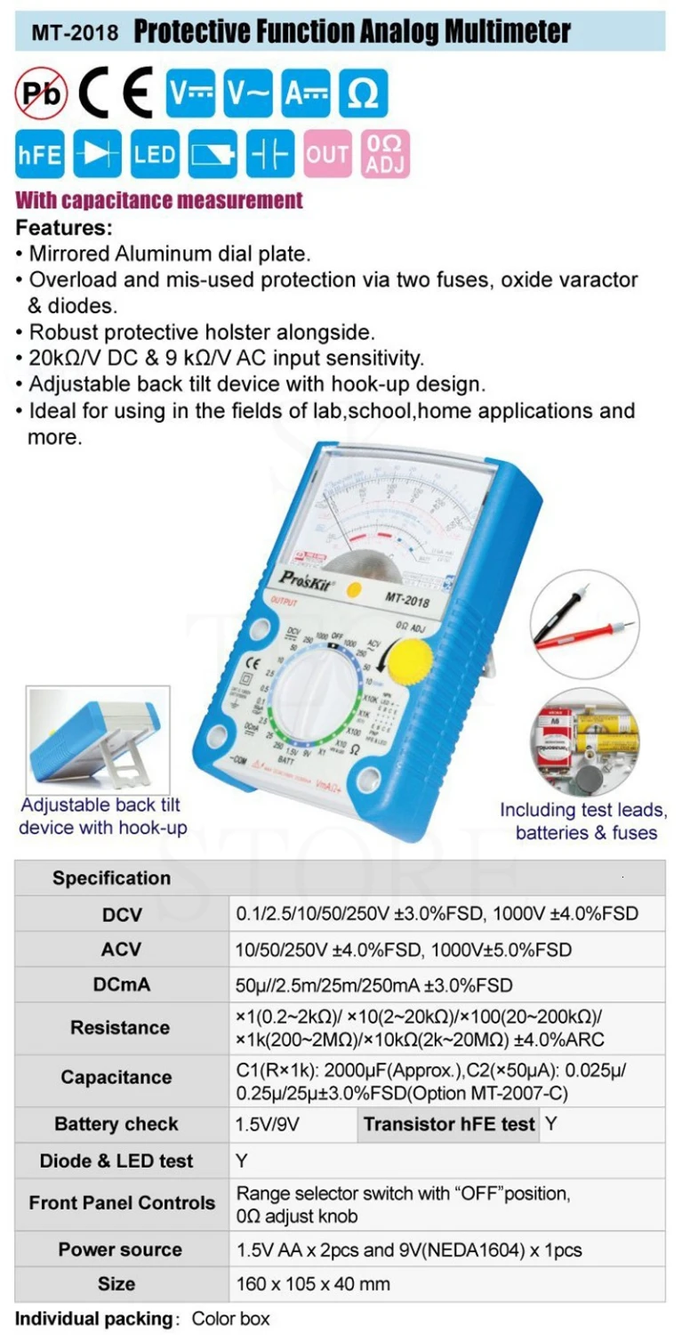 2. Батарея: 1,5 V AAx2pcs и 9V(NEDA1604) x1pcs (не прилагаются)