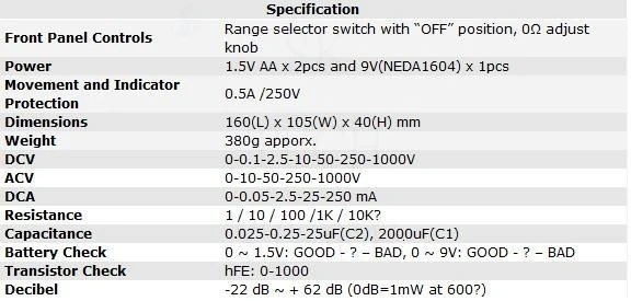 Сопротивление: x1(0.2-2kΩ)/ x10(2-20kΩ) x100 (20-200kΩ)/