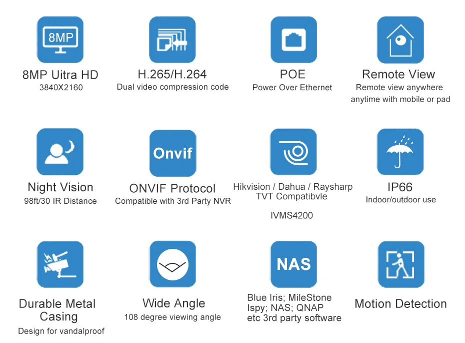 Благодаря 1/3 "UHD cmos-датчику, эта камера безопасности плавает во всей сцене, динамически окрашивая все яркие цвета и богатые изображения, пиксели по пикселю в захватывающем разрешении 8MP 3840*2160P.