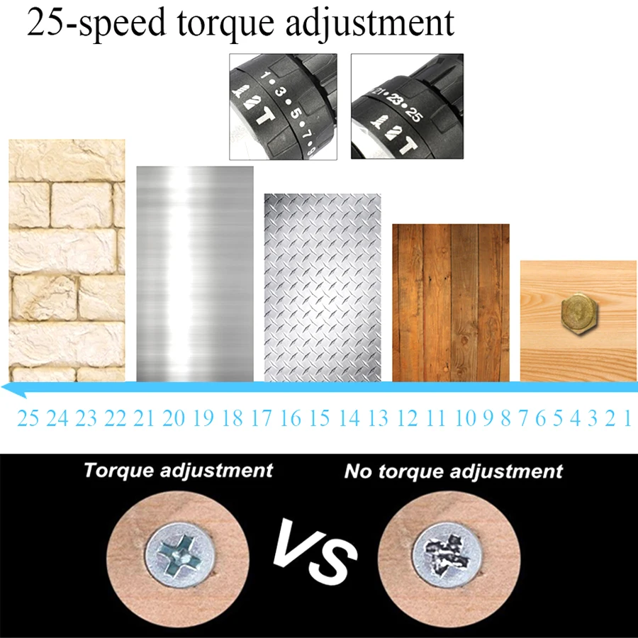 3. 25-ступенчатая Регулировка крутящего момента обеспечивает 25 настроек крутящего момента.