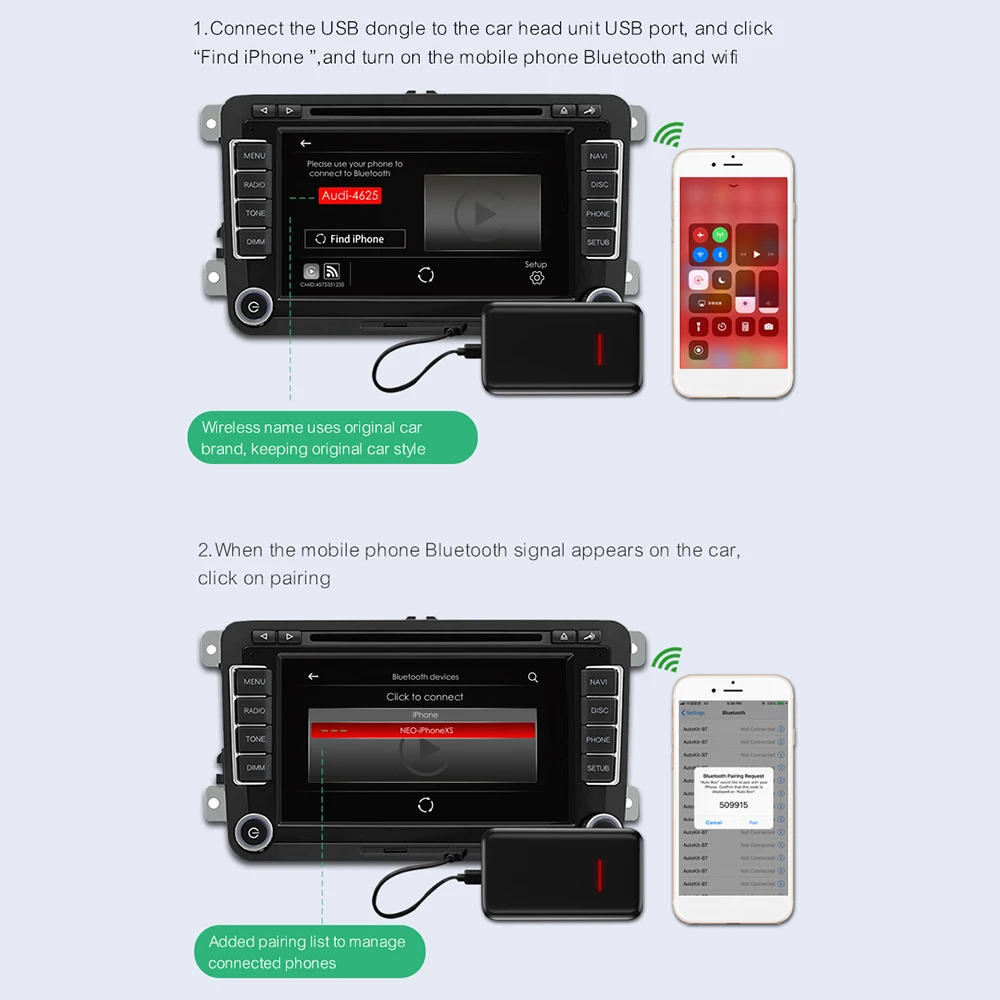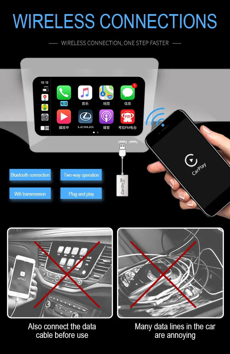 1. Вставьте продукт в порт USB оригинального хоста автомобиля, нажмите активный поиск и Включите Bluetooth и wifi на мобильный телефон. 2. Нажмите на bluetooth сигнал на мобильный телефон, который появляется на машине автомобиля, выберите сопряжение мобильный телефон, а затем используйте Apple Carplay для реализации беспроводного подключения.
