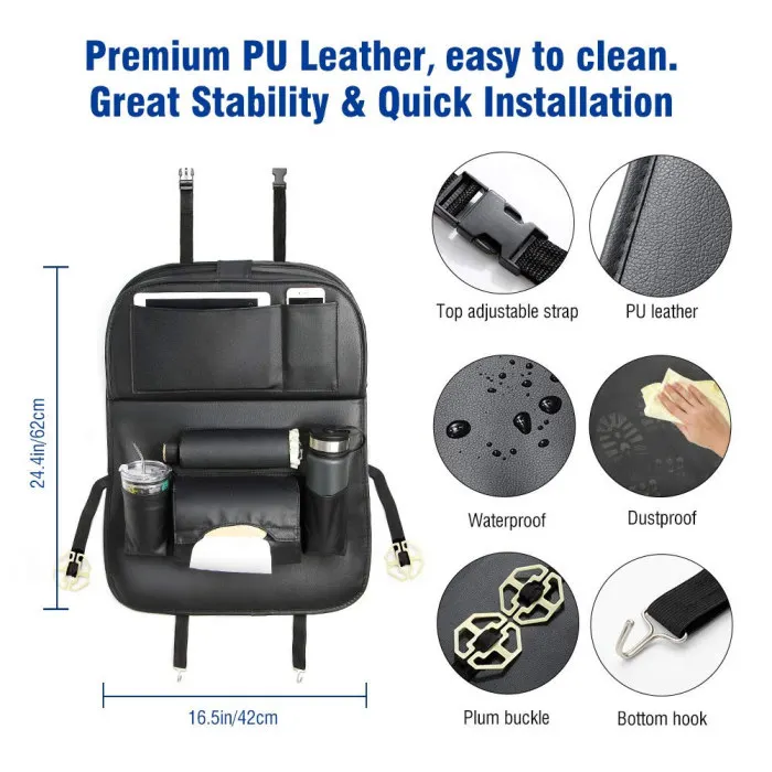 Высококачественная искусственная кожа, легко моется:Изготовленный из высококачественной искусственной кожи с красивой текстурой личи, этот органайзер для заднего сиденья автомобиля является водонепроницаемым, устойчивым к царапинам, антиударным и стильным. Защитный чехол для автомобильного сиденья. С чистящей тканью ваш Органайзер на заднем сиденье снова выглядит как новый.