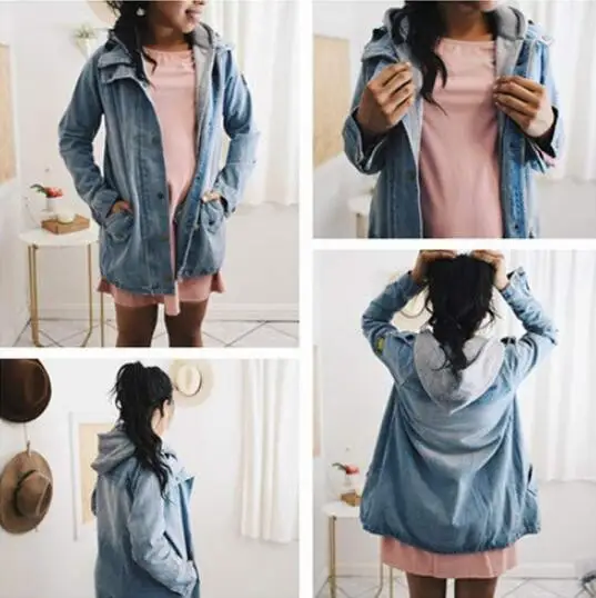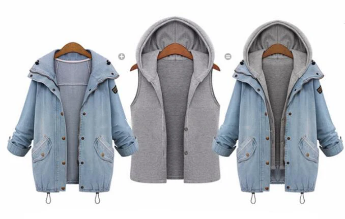 2. Особенность: простой, с капюшоном, Повседневный, пальто, молния, однобортный, весна, осень, короткий, длинный рукав. 2 предмета: джинсовое пальто + серый жилет с капюшоном.