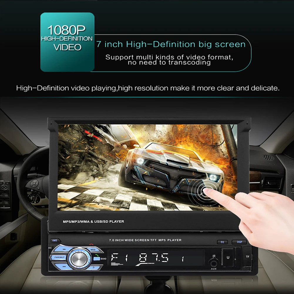 1. 7 дюймов большой экран, чтобы удовлетворить потребности аудио и видео. Разрешение экрана составляет 800x480, Поддержка U диска/tf-карты устройства, функция воспроизведения памяти, AUX аудио вход, LRC лирика и ID3 дисплей, дистанционное управление, зарядка usb-устройства.