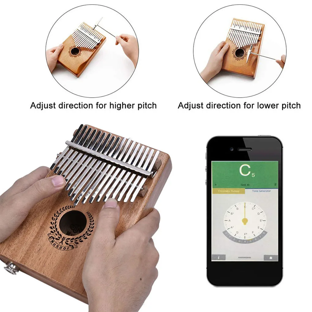 Металлические ключи калимбы крепятся на ящик из твердой древесины, который выступает в качестве резонансной камеры.