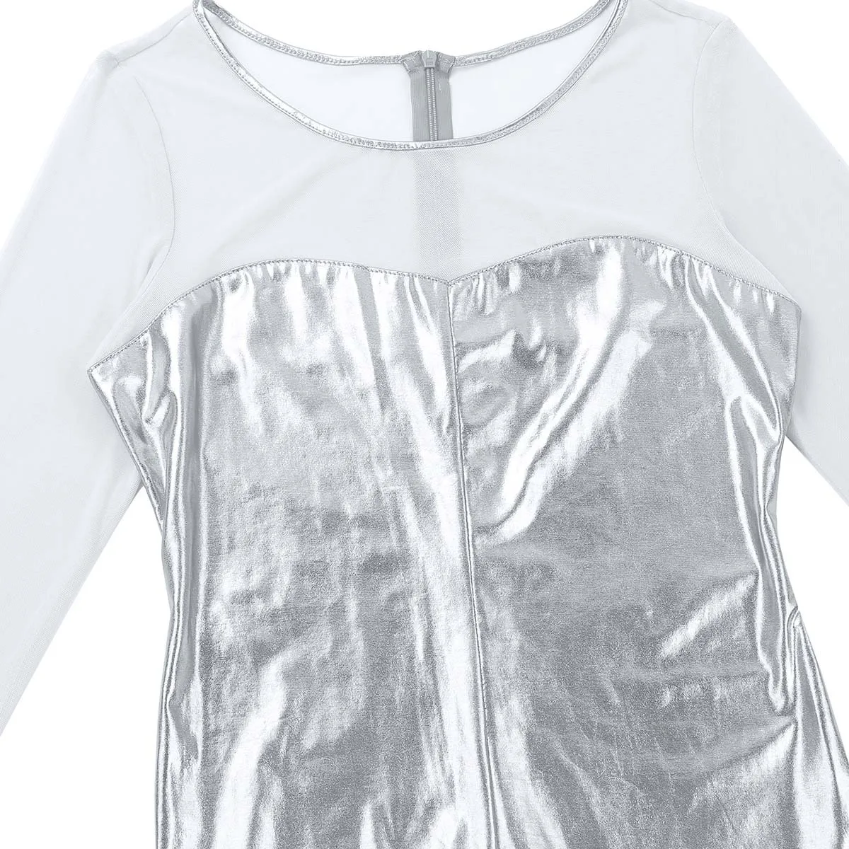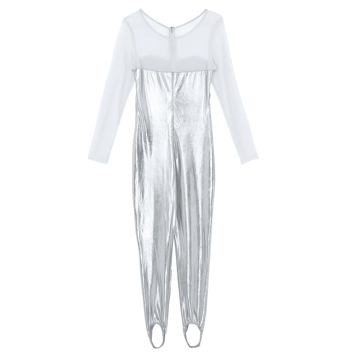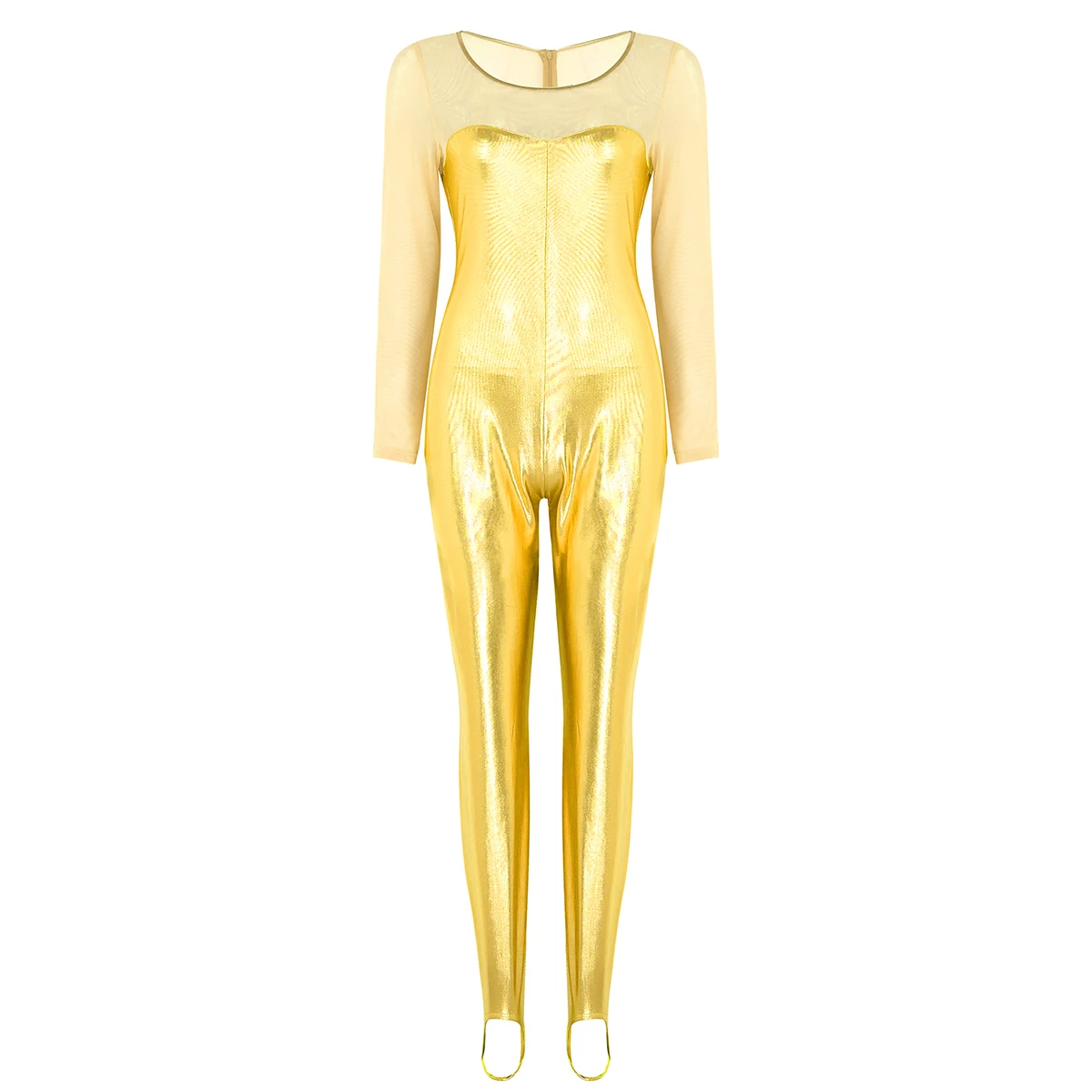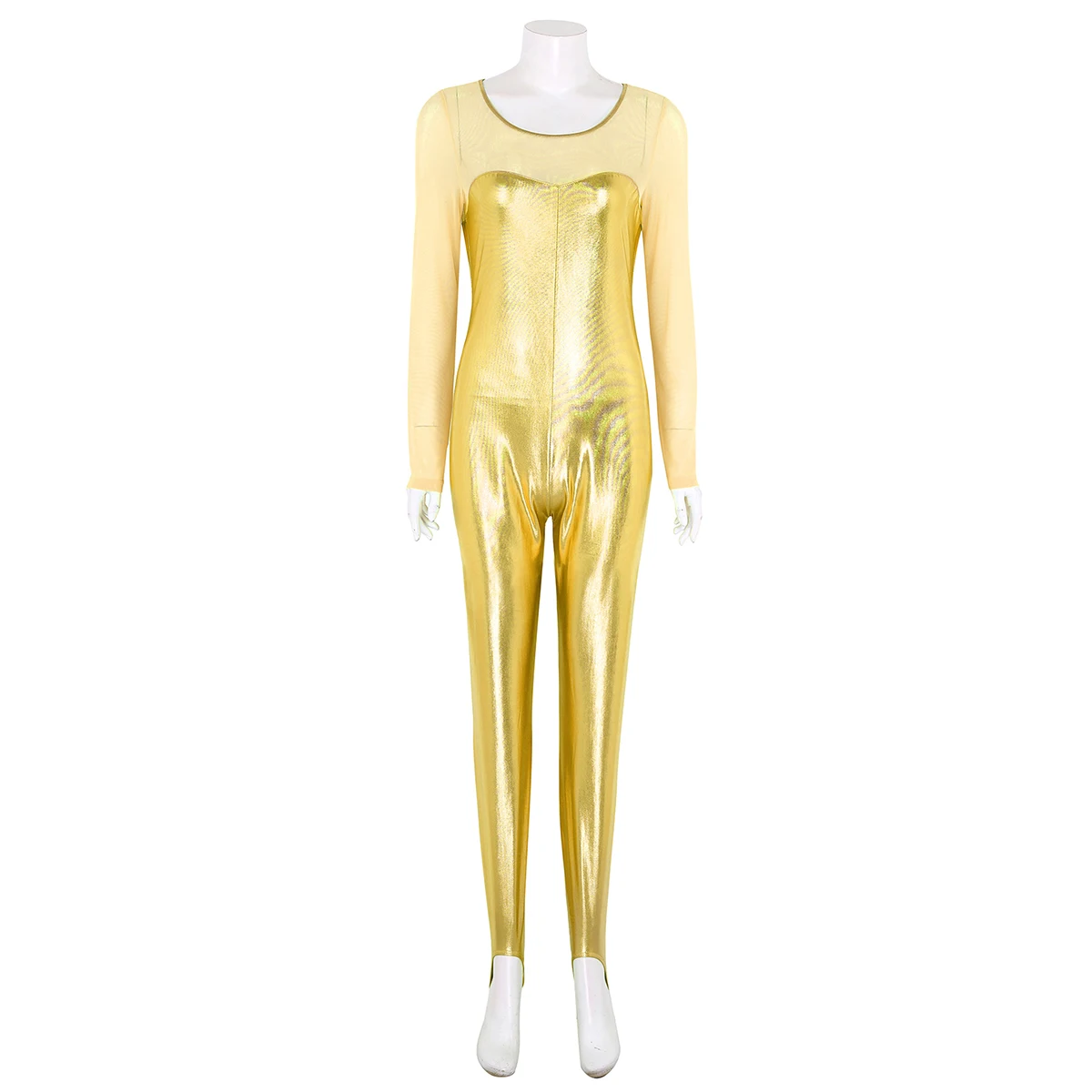 Женский слитный купальник с блестящим металлическим рисунком, боди для танцев, скрытая молния сзади. Овальный вырез и длинные рукава, прозрачный сетчатый лиф с соединением внакрой, мешалки для ног, чтобы избежать движения. Хорошо тянущаяся и мягкая ткань, плотно прилегает к телу, хорошо тянется, притягивает глаза. Идеально подходит для вечеринок, ночных клубов, сценических представлений, костюмированных вечеринок, Хэллоуина и т. д. Перед покупкой внимательно сверьтесь с таблицей размеров, рекомендуется ручная стирка.
