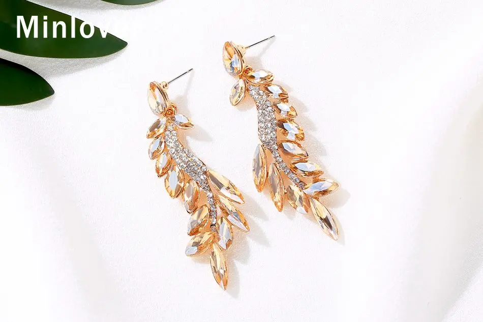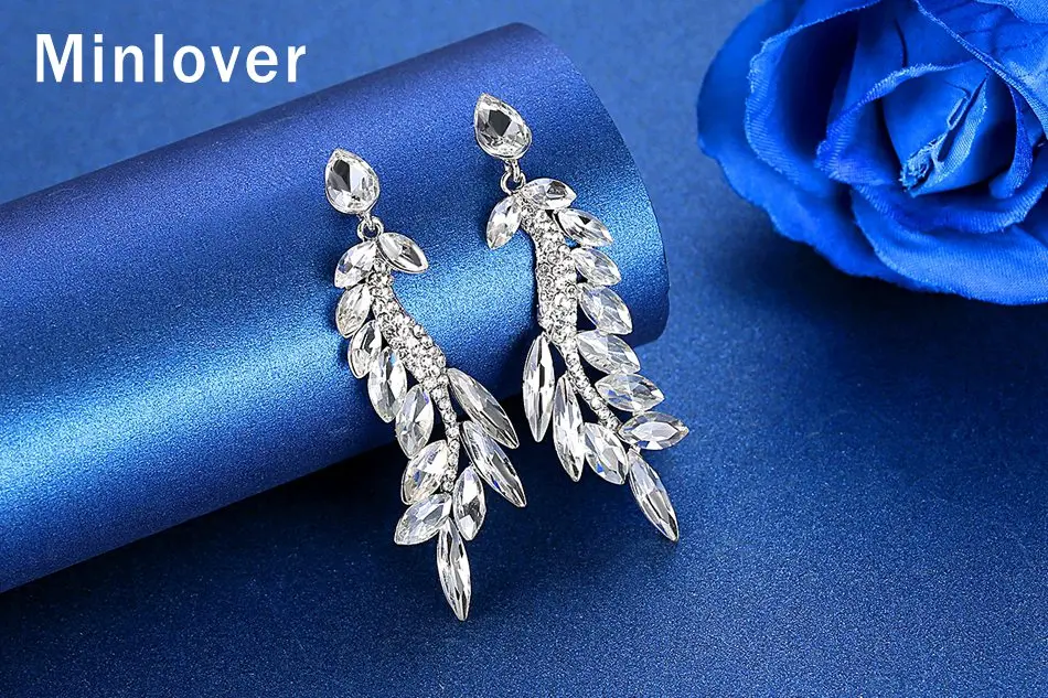 Женские свадебные висячие серьги Minlover, серебристый лист, длинные висячие серьги с кристаллами, вечерние ювелирные изделия, MEH1633