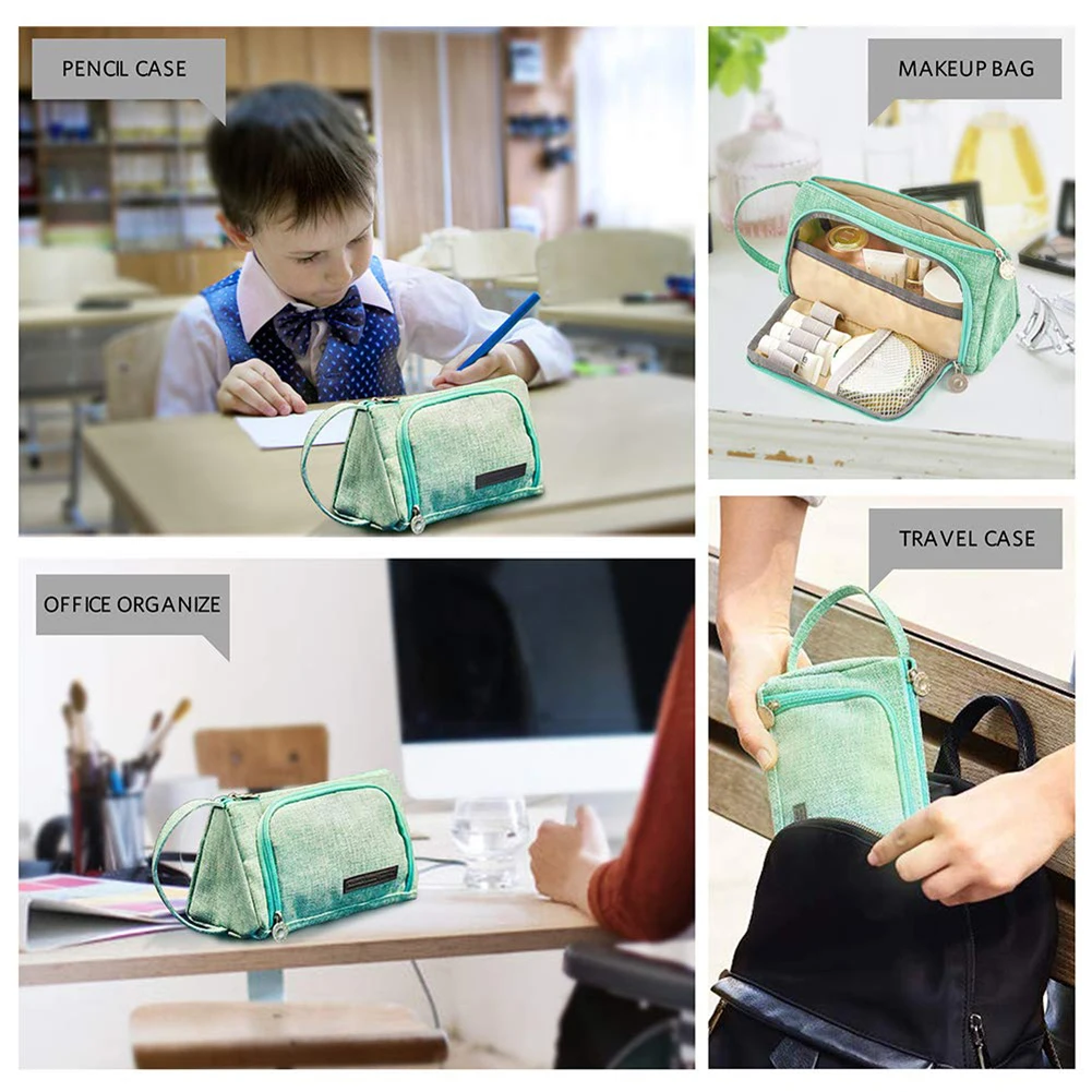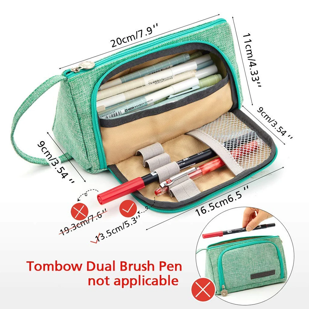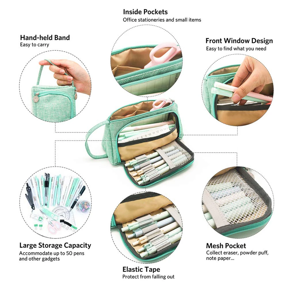 Уникальный дизайн: открывается вбок (для удобства просмотра и доступа) или сверху. Основное отделение на молнии легко помещается в маркеры, ручки-щетки и 2 кармана внутри можно хранить ластики, Липкие заметки, карты, билетов или другие предметы, чтобы все было организовано; боковое отделение на молнии, которое имеет 5 слотов, может зафиксировать обычно используемые ручки.