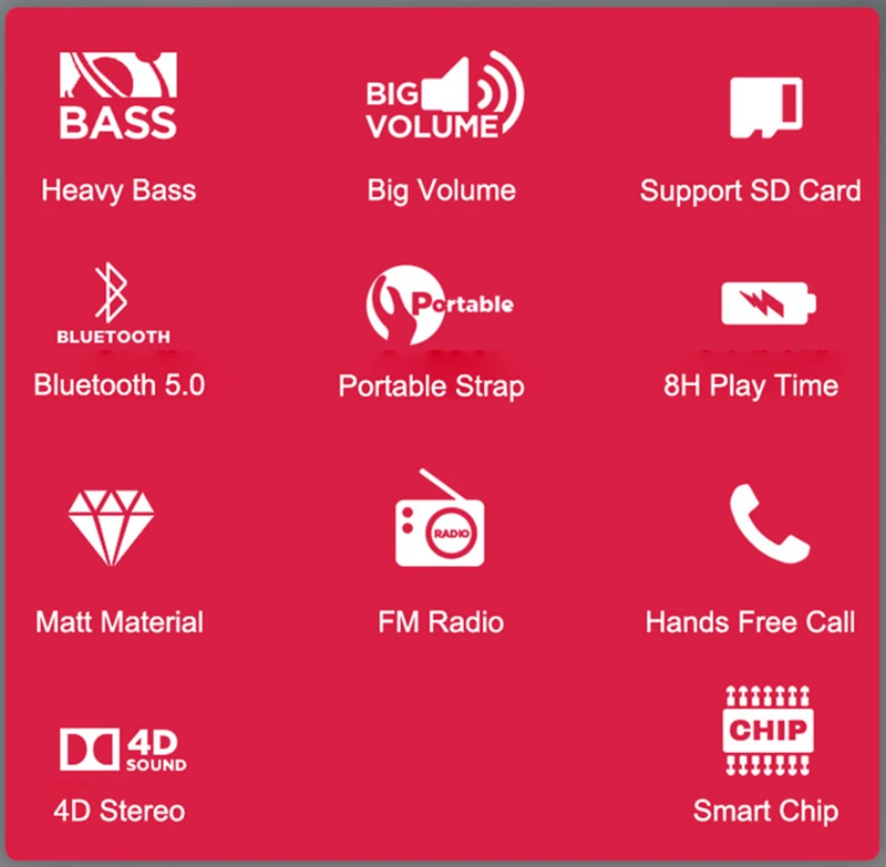 1. 500 мАч супер емкость батареи в режиме воспроизведения музыки наслаждаться музыкой в любом месте и в любое время и в любом месте 2. Поддержка TF карты функция, Макс 16GB (не входит в комплект) 3. Дальность передачи до 10 м 4. Поддержка micro USB, 3,5 мм AUX,TF карта, USB2.0 порты 5. Низкое энергопотребление. Напряжение на выходе громкоговорителя 10W 6. Поддержка голосовых вызовов функция 7. Отлично подходит для занятий спортом на открытом воздухе и занятий спортом и путешествий и так далее 8. Цвет: синий. Черного цвета. Красным цветом. Серый. Камуфляжной расцветки. Красным цветом. Параметры: