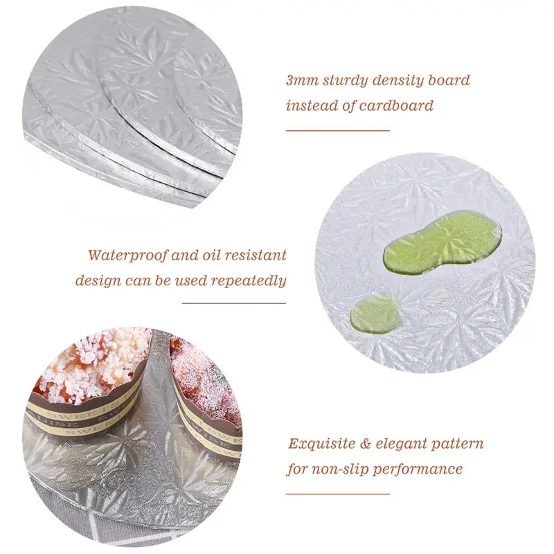 -Слой из оловянной фольги украшен деликатными узорами для защиты от скольжения и водонепроницаемости. Подходит для тортов различных размеров. Просто протрите полотенцем. Легко чистить и использовать повторно.